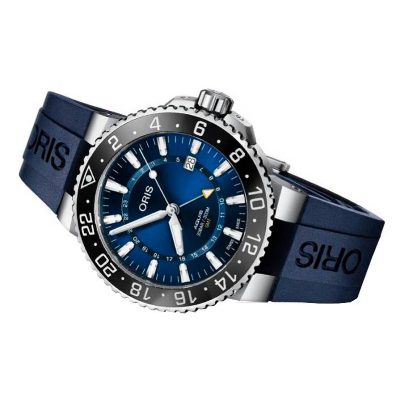Depuis 1904, la maison horlogère Oris poursuit sa quête perpétuelle de la perfection de ses garde-temps, tout en conservant ses valeurs initiales, ce qui en fait la force de cette marque prestigieuse. Grâce à sa qualité suisse, son esprit innovant et sa technologie respectable, sa réputation l'a précédée et a fait d'elle une référence en matière d'horlogerie. Son univers est assez large afin que vous puissiez choisir le modèle qui vous correspondra, mais sachez que chacun d'entre eux promeut l'excellence, due au travail impressionnant des maîtres artisans. Si vous êtes un passionné des fonds marins et que vous recherchez un compagnon pour vous accompagner lors de vos excursions, les garde-temps de la collection Aquis GMT Date sont faits pour vous. Empreints d'une haute performance, ils regroupent en leur sein toutes les caractéristiques dont vous aurez besoin afin de faciliter et de rendre agréable vos activités. Le modèle 01 798 7754 4135-07 4 24 65EB est composé d'un boitier en acier inoxydable, possédant des dimensions idéalement adaptées à un poignet masculin, avec ses 43.50mm de diamètre. Il est recouvert par une lunette en céramique qui arbore une teinte noire et sur laquelle une graduation ainsi qu'une numérotation en 24 heures apparaissent. Rotative, elle vous servira à mesurer votre temps d'immersion sous l'eau ou encore de profiter d'un autre fuseau horaire, en alignant la lunette sur l'aiguille des heures. De plus, sachez que pour une sécurité supplémentaire, cette montre de plongée accueille une couronne vissée à trois heures. Ainsi, l'eau ne pourra s'infiltrer au coeur du boitier et vous pourrez régler facilement les aiguilles et la date grâce à elle. Par ailleurs, cette étanchéité de 30 ATM vous est également garantie par à la présence d'un fond de boite vissé. Ce dernier vous offrira une vision délicate sur la masse oscillante, car il est transparent et est recouvert par un verre saphir, légèrement bombé. De même, la face avant est surplombé par ce verre qui est traité contre les reflets, qui peuvent être dérangeants.