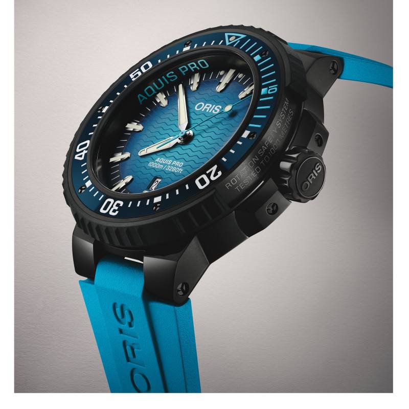 Le cadran de la montre Oris Aquis Pro 1000M est d'une beauté éclatante, façonné dans un superbe bleu dégradé avec un motif de vagues qui évoque les profondeurs océaniques. Les index et aiguilles luminescents en SuperLuminova C3 assurent une lisibilité parfaite, même lors des plongées nocturnes. Le chemin de fer des minutes demeure un repère fiable pour mesurer le temps écoulé avec précision. De plus, le cadran intègre un guichet de date subtil à 6 heures, s'harmonisant parfaitement avec son design dynamique et fonctionnel.