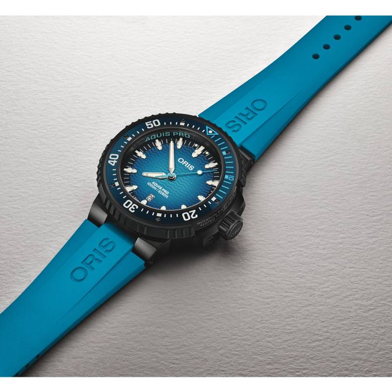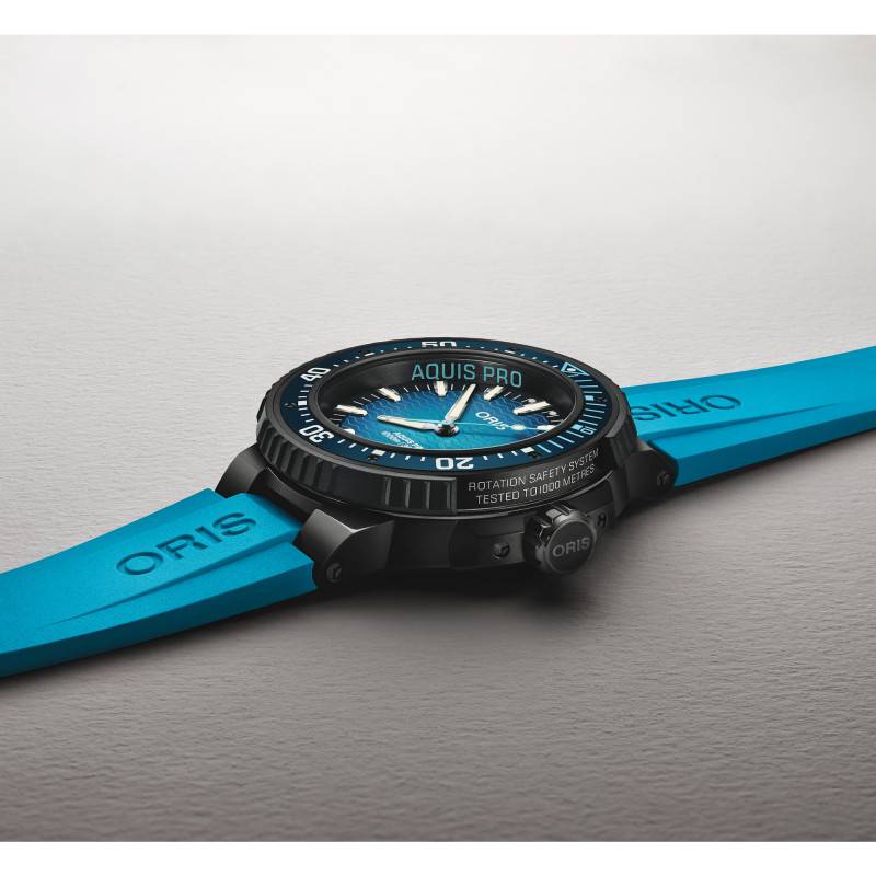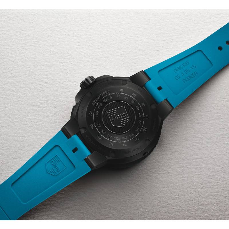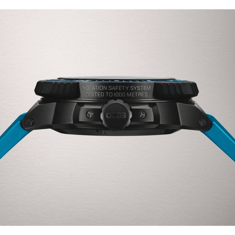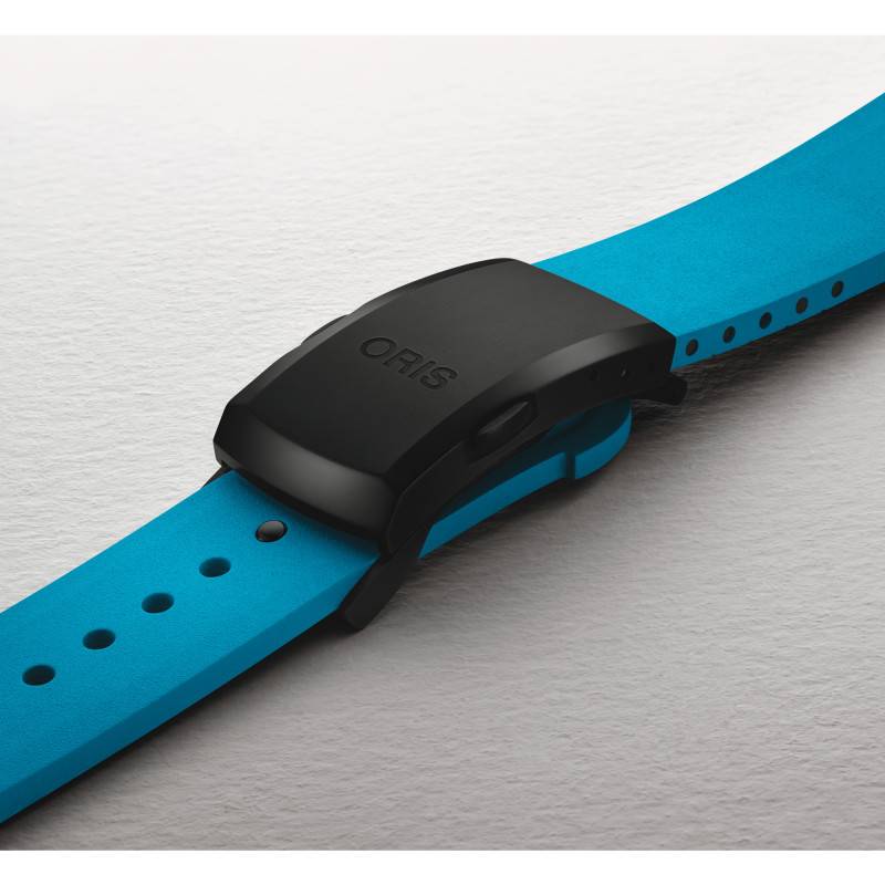 La montre Oris est dotée d'un bracelet en caoutchouc bleu, conçu pour résister aux environnements marins difficiles. Ce matériau assure confort et flexibilité, adapté aux besoins des plongeurs. Une boucle déployante avec fermoir de sécurité offre une fixation fiable, essentielle lors des mouvements sous l'eau. De plus, le bracelet est interchangeable et vient accompagné d'une option noire, permettant de varier le style.