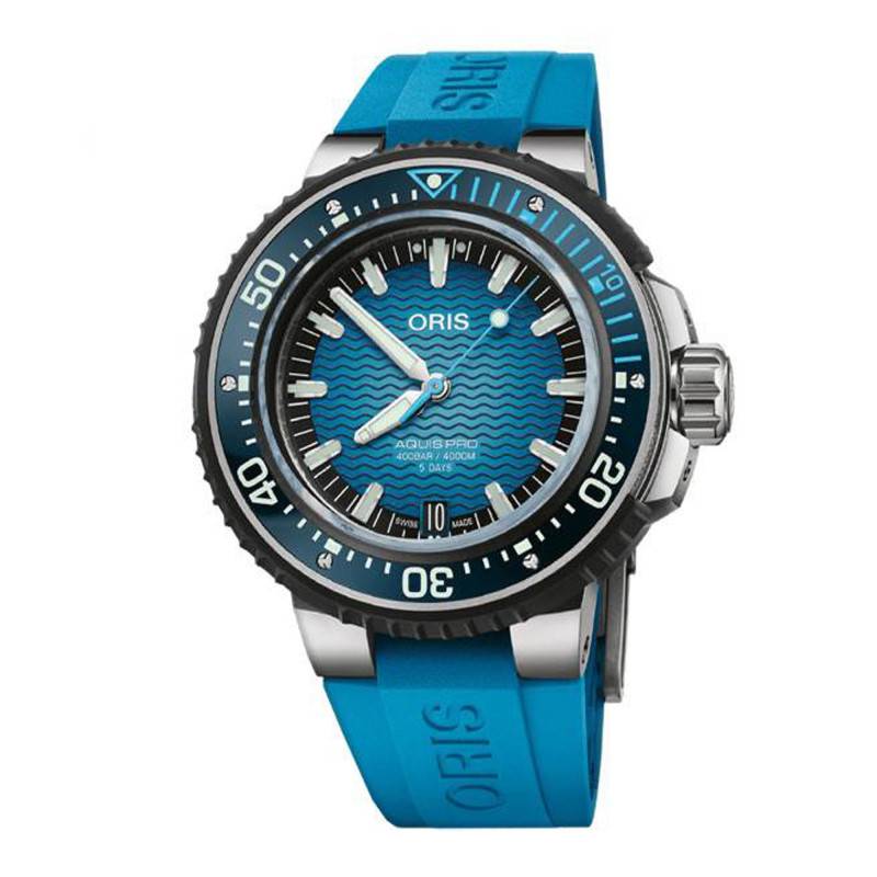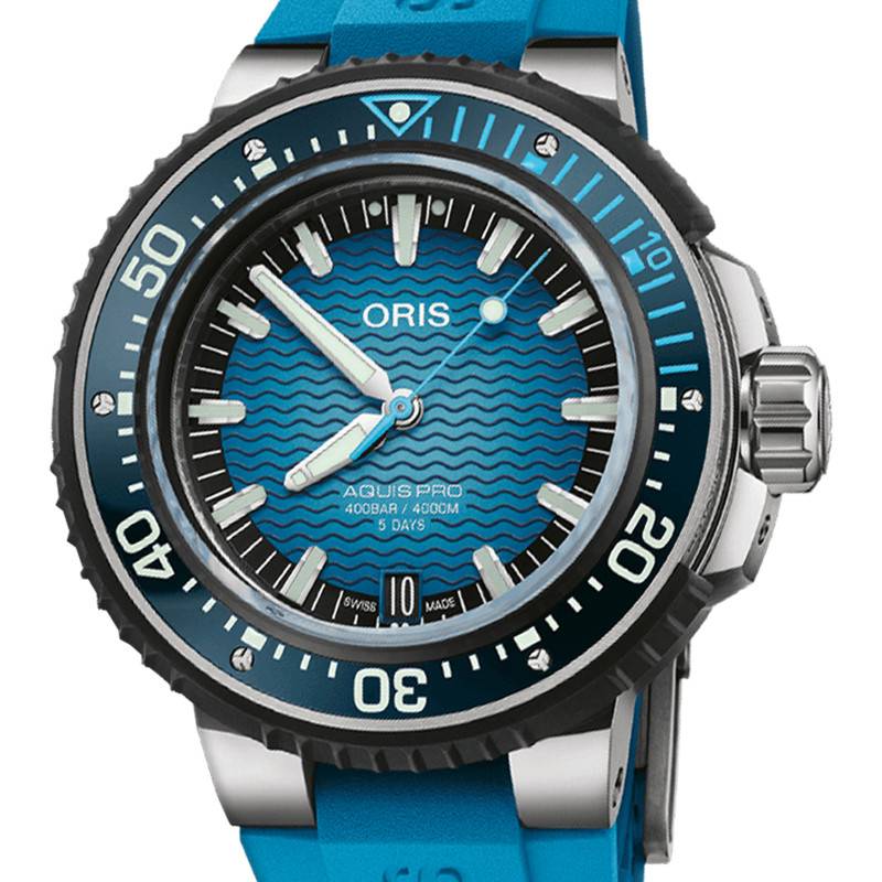 Les garde-temps Oris sont l'expression du savoir-faire et de l'expertise de la marque qui s'impose depuis 1904. La marque se veut dynamique et innovante et propose à travers ses collections des créations toujours plus singulières, innovantes et élégantes pour le bonheur des passionnés. Sa collection Aquis propose des montres de plongée disposant d'un ensemble de fonctionnalités très utiles. En démontre ce superbe modèle AquisPro 4000M 01 400 7777 7155-S doté d'un design soigneusement conçu, de matériaux performants et de technologies innovantes. Il séduit par sa carrure imposante et épurée dépourvue de tout superflu. Son boîtier rond, conçu en titane multipièces, mesure 49,50 mm de diamètre et le destine aux poignets des hommes. Il accueille une lunette crantée et rotative en céramique dotée d'une échelle de minutes luminescente qui se verrouille et se déverrouille grâce au RSS. C'est un système installé en dessous du rehaut de la lunette en caoutchouc vulcanisé noir qui permet de libérer l'échelle des minutes afin de régler le temps de plongée et de le sécuriser. Le cadran est recouvert d'un verre saphir bombé sur les deux faces qui le protège des chocs et des rayures pouvant nuire à son esthétique. Son traitement anti-reflet sur la face intérieure offre une lisibilité optimale des éléments centraux sous tous les angles. Vous pourrez régler à votre convenance les indicateurs de cette montre grâce à la couronne de sécurité crantée et vissée à 3 heures. Pour finir, ce modèle est étanche à 400 ATM grâce à son fond de boite vissé réalisé en titane et marqué de gravures spéciales.