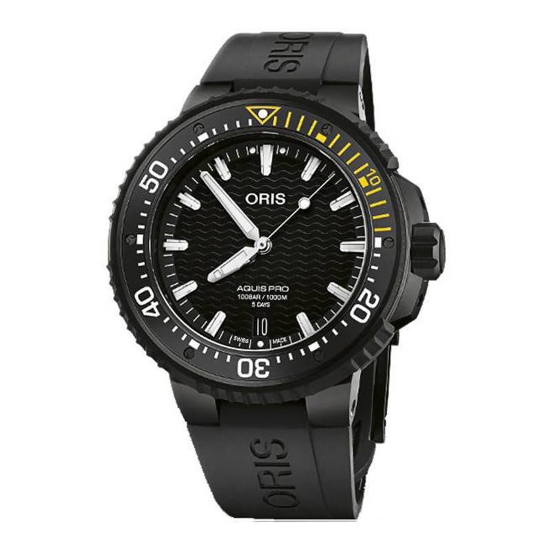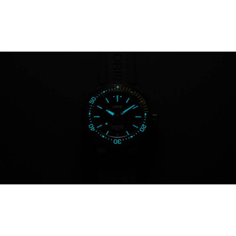 La maison horlogère Oris vous propose de découvrir aujourd'hui un nouveau modèle d'exception, la Montre AquisPro Date 01 400 7767 7754-07 426 64BTEB. Depuis plus de 100 ans, la marque a su se spécialiser dans les montres de type plongeuses. Alliant design sportif et raffinement, ce modèle, conçu pour les amateurs de plongée, renferme de nombreuses technologies. C'est un boîtier composé d'acier inoxydable PVD noir qui vient se placer au cœur de cette montre. Sa forme ronde épousera parfaitement les courbes des poignets masculins. Ses dimensions plutôt robustes sont idéales pour la gent masculine, le diamètre de son boîtier est de 49.5 millimètres. Posée au-dessus de ce boîtier, une lunette en céramique noire avec graduation des minutes est présente. De légères touches de jaune apportent un coup d'éclat à cette montre. Cette dernière a été testée pour pouvoir tourner en étant étanche jusqu'à 1000 mètres de profondeur, de quoi ravir les amateurs de plongée ! Afin de protéger le sublime cadran de tous les coups et rayures que vous pourriez créer lors de toutes vos activités, un solide verre saphir bombé sur les deux faces le surplombe. Connu dans le milieu horloger pour sa dureté, il bénéficie en plus d'un traitement antireflet qui vous offrira un confort optimal lors de l'utilisation de votre montre. Par ailleurs, vous retrouverez à trois heures la traditionnelle couronne crantée qui vous permettra de faire le réglage de vos aiguilles ainsi que du guichet date. Cette dernière est vissée, ce qui la rend totalement étanche lors de vos plongées. Enfin, le fond de boîte vissé est composé de titane et vous assure une superbe étanchéité de 100 ATM. Une échelle de conversion des mètres en pieds est gravée sur ce fond de boîte.