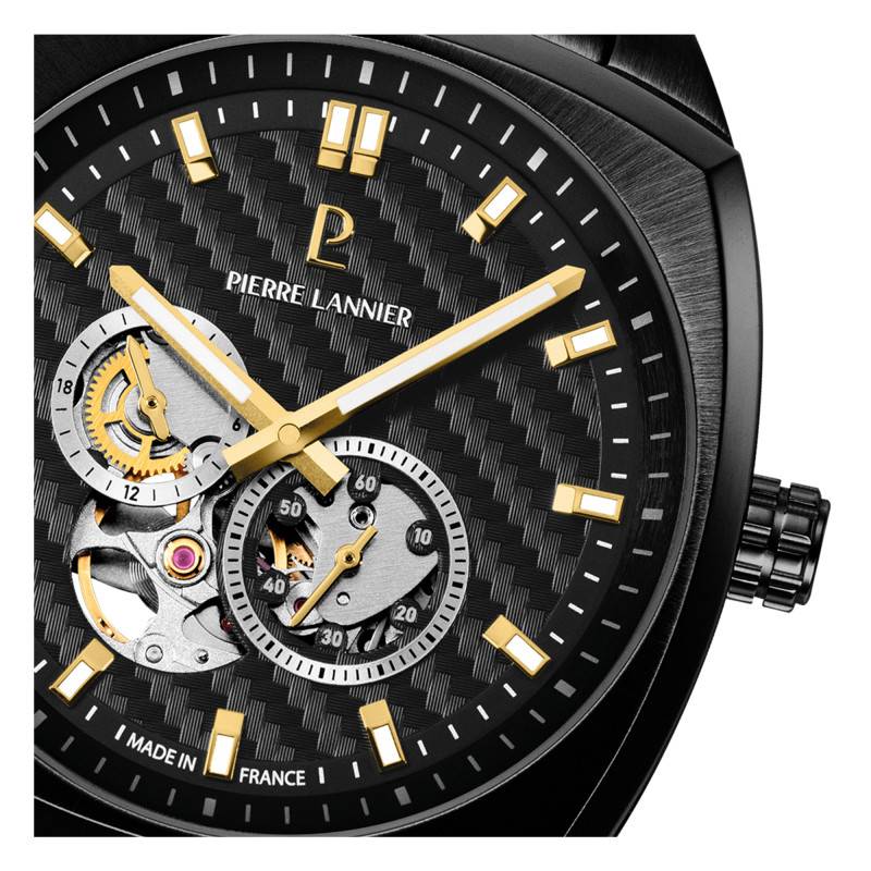 La montre Pierre Lannier Arcadius se distingue par son allure contemporaine et masculine qui saura séduire les amateurs de pièces horlogères modernes. Le boîtier en forme de coussin est confectionné en acier inoxydable avec une finition mate. Ce revêtement PVD noir ajoute une touche de sophistication tout en assurant une grande résistance aux rayures. Avec un diamètre de 42,50 mm et une épaisseur de 11,65 mm, cette pièce impose une présence certaine au poignet, idéale pour l'homme moderne cherchant à allier style et robustesse. La montre pèse un total de 116 g, offrant ainsi une sensation de stabilité et de solidité lors du port. Fabriquée en France, cette montre témoigne d'un savoir-faire horloger exceptionnel tout en bénéficiant d'une garantie internationale de 2 ans.