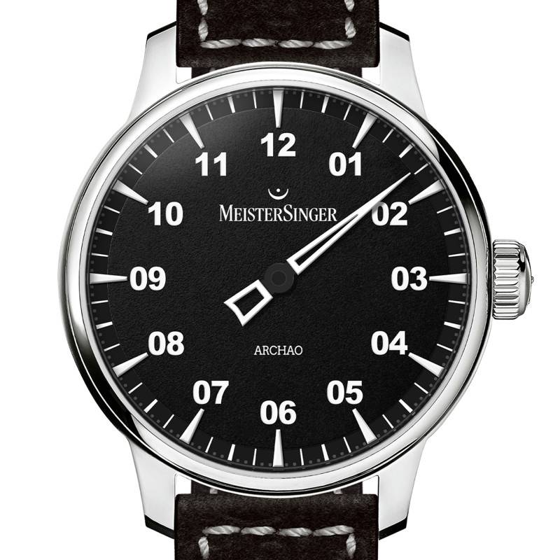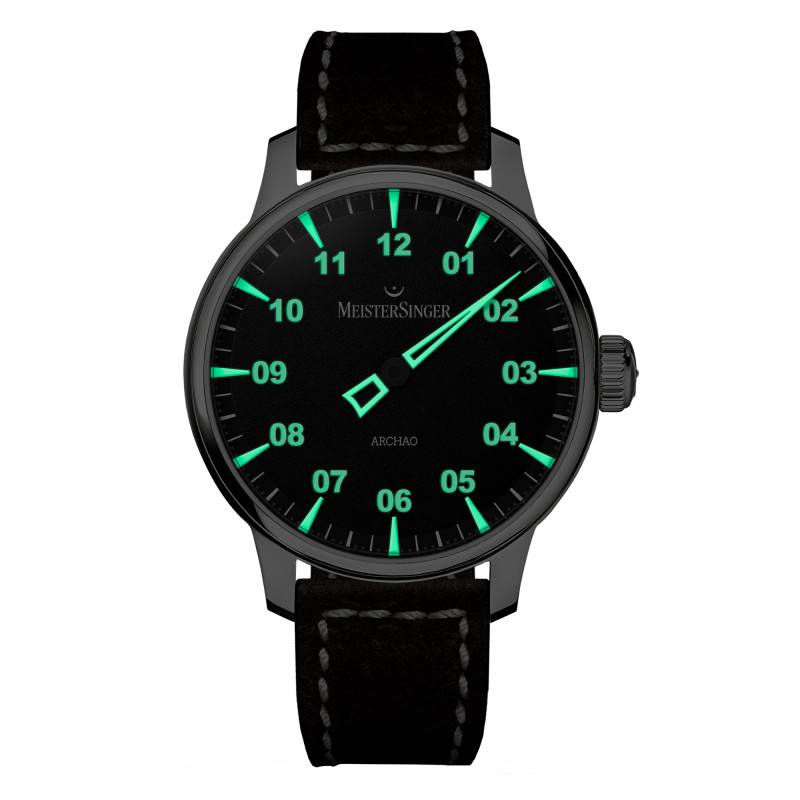 Le cadran noir de la MeisterSinger Archao est subtilement grainé, ajoutant une touche texturée à l'apparence globale de la montre. La disposition mono-aiguille innovante est le pivot autour duquel tout le design tourne. Cette unique aiguille luminescente balaie les chiffres arabes également luminescents, rendant la lecture de l'heure intuitive et singulière. Les index sont tout aussi luminescents, garantissant une visibilité optimale même dans l'obscurité.