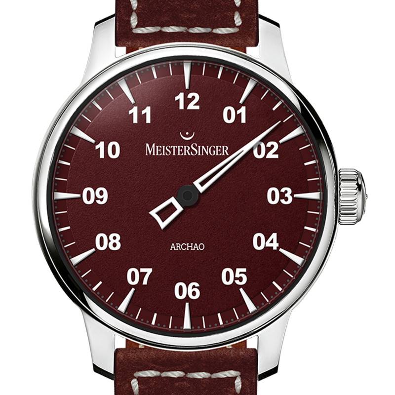 Le cadran de la MeisterSinger Archao se distingue par sa finition grainée, qui ajoute une texture sophistiquée au rouge profond du design. Les chiffres arabes sont grands, lisibles et luminescents, assurant une lisibilité optimale même dans l'obscurité. L'aiguille unique, signature de la marque, simplifie la lecture du temps tout en ajoutant une élégance minimaliste indéniable. Le choix de l'affichage analogique et des indices également luminescents contribue à l'esthétique sobre mais audacieuse du cadran.