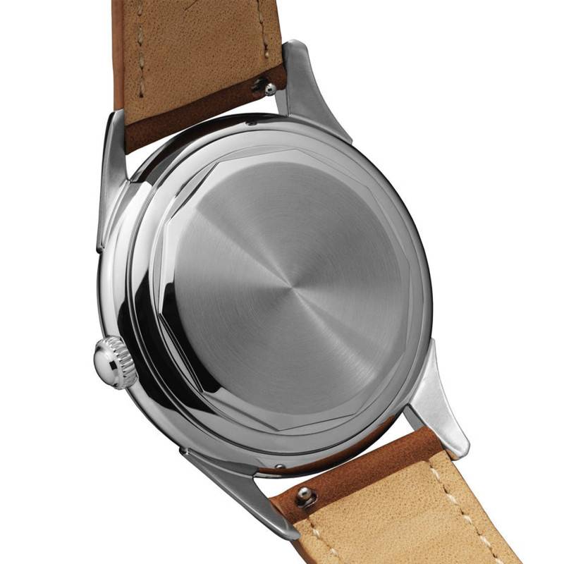Le cadran de cette montre est une démonstration de simplicité et de sophistication. Doté d'un fond de couleur beige, il affiche des chiffres arabes élégamment disposés, facilitant la lisibilité grâce à une finition mat qui évite les reflets indésirables. Le cadran est protégé par un verre saphir bombé, réputé pour sa résistance exceptionnelle aux rayures, et est doté d'un double traitement antireflets pour assurer une lisibilité parfaite sous toutes les conditions de lumière. Un chemin de fer des minutes entoure le bord du cadran, ajoutant une touche d'élégance classique. Les aiguilles précises indiquent les heures, minutes et secondes, tandis que le discret logo de la marque est inscrit à 12 heures, rendant hommage à l'héritage suisse raffiné de la montre.