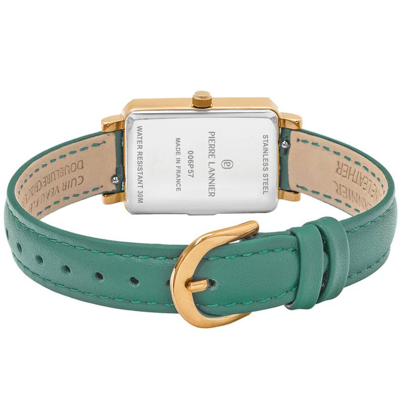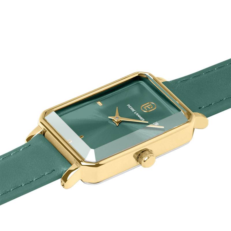 Le cadran, teinté d'un vert profond, joue avec la lumière grâce à sa finition semi-mate, offrant ainsi un contraste élégant avec les aiguilles dorées. Cette harmonie chromatique souligne un design cohérent et sophistiqué. L'absence d'index ou de chiffres renforce l'esthétisme minimaliste de la montre, laissant les aiguilles heure et minute faire leur ronde avec grâce. Le logo Pierre Lannier est subtilement apposé sous midi, ajoutant une touche délicate à l'ensemble. Protégé par un verre minéral résistant, le cadran conserve sa beauté et sa lisibilité, même avec une utilisation quotidienne.