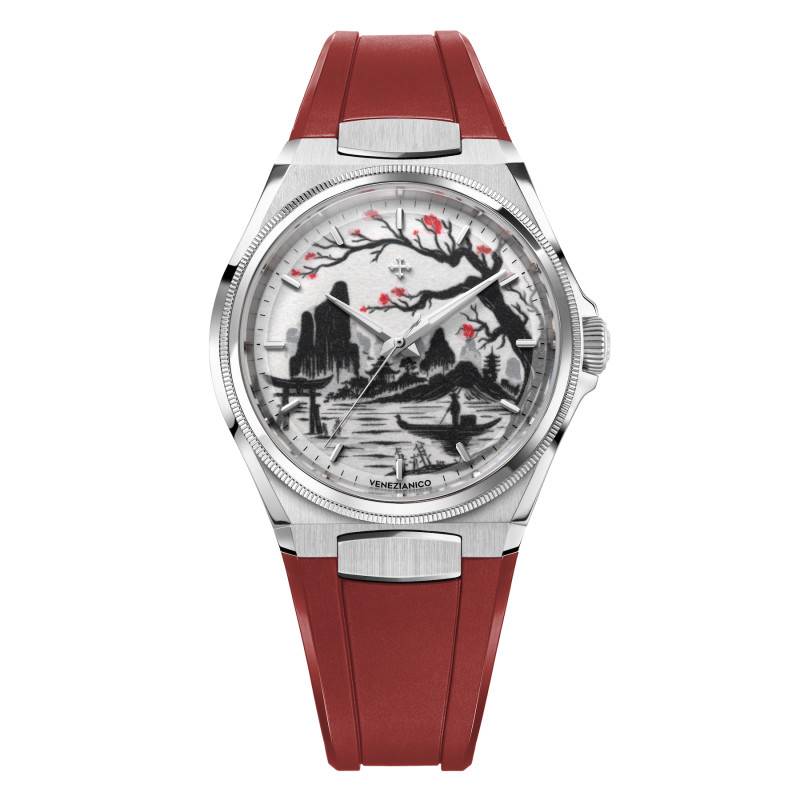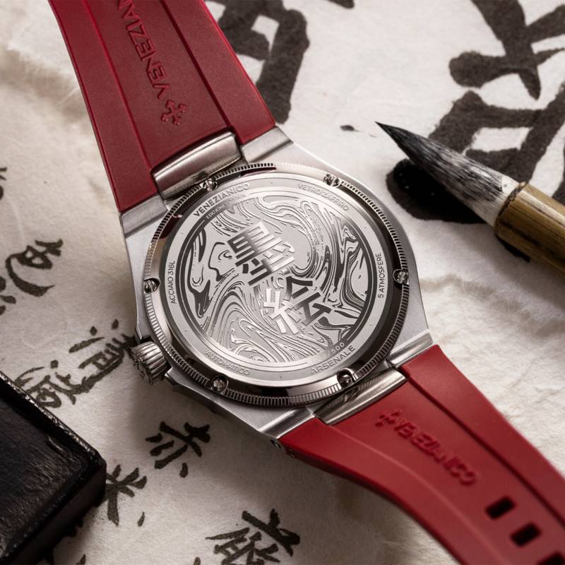 La montre Arsenale Sumi-e par Venezianico est une pièce exceptionnelle, en édition limitée à 500 exemplaires, alliant l'art ancestral japonais du Sumi-e à l'ingénierie horlogère contemporaine. Son boîtier tonneau en acier inoxydable 316L offre une durabilité remarquable tout en apportant une touche moderne et un gage de solidité grâce à sa fabrication précise. Mesurant 40 mm de diamètre avec une épaisseur de 9,95 mm, ce modèle se distingue par sa silhouette élégante et ses proportions harmonieuses. La surface du boîtier présente une double finition, avec des sections brossées et satinées qui capturent la lumière sous différents angles et des touches polies pour un contraste saisissant. Un choix de matières nobles et de finitions soignées fait de cette montre une œuvre d'art portable, renforcée par les gravures schématisées des caractères japonais ‘墨絵' (Sumi-e) au fond du boîtier.