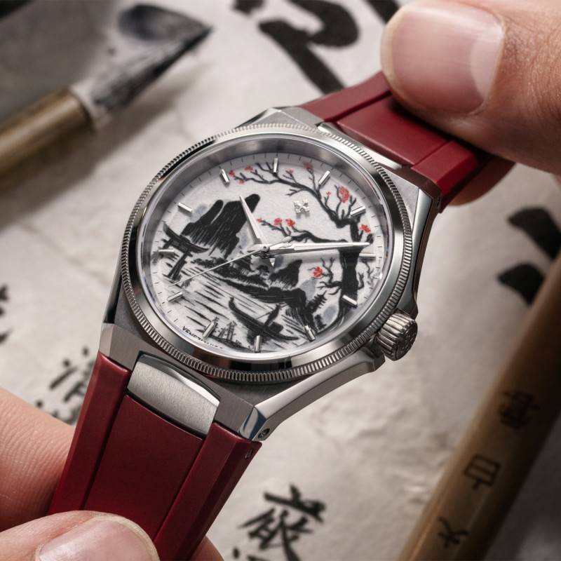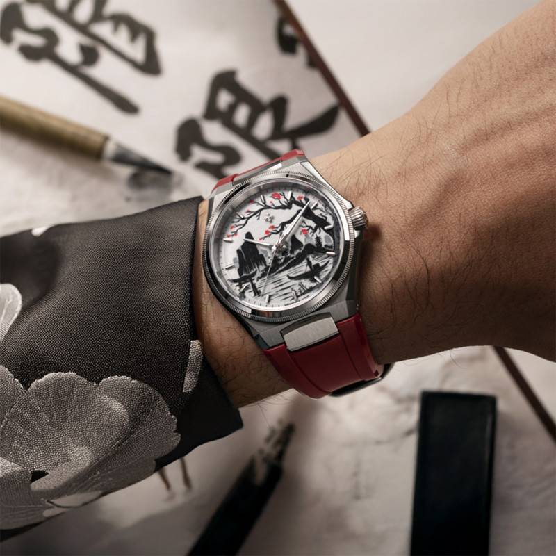 Le cadran de la montre Arsenale Sumi-e est une représentation époustouflante de l'art du Sumi-e, utilisant le papier Washi pour créer un paysage poétique et intemporel. Chaque cadran, orné d'un motif travaillé par un procédé complexe de tampographie en cinq étapes, est unique dans son expression artistique, capturant l'âme du paysage japonais avec précision et élégance. Les nuances délicates et les contrastes intenses recréent l'effet de l'encre qui coule naturellement, transmettant une profondeur visuelle rare. Ce cadran est en outre muni d'aiguilles luminescentes, garantissant une lisibilité optimale grâce au SuperLuminova BG W9, une technologie moderne appliquée sur chaque élément pour assurer une visibilité claire et prolongée dans des conditions de faible luminosité. La narration visuelle continue avec le chemin de fer des minutes, qui assure une précision supplémentaire et ajoute une touche de sophistication classique.