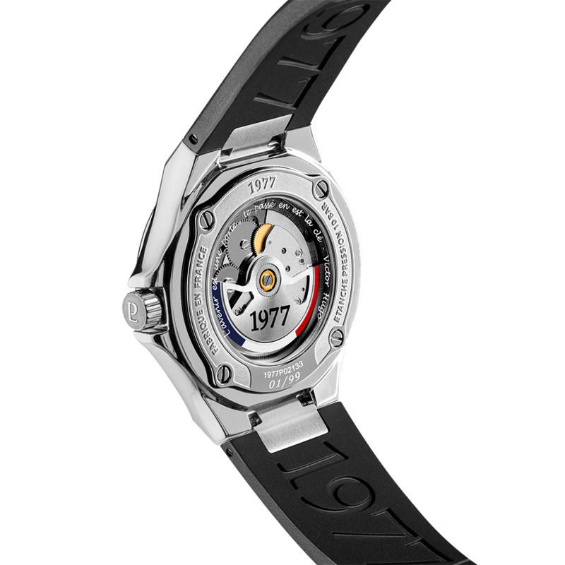 Cette montre dispose d'un boîtier rond de 41 mm en acier inoxydable 904L. Avec sa finition polie et satinée, elle offre un reflet subtil qui souligne la qualité des matériaux utilisés. Pesant 125 grammes, ce modèle est à la fois robuste et agréable à porter au quotidien. La couronne vissée améliore l'étanchéité. Le fond, maintenu par des vis, garantit une solidité accrue. La gravure au dos avec la citation de Victor Hugo, « L'avenir est une porte, le passé en est la clé. », ajoute une touche symbolique et poétique à cette montre. De plus, ce garde-temps est certifié Origine France Garantie, attestant de sa fabrication majoritaire en France.