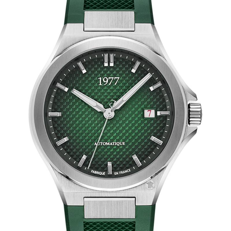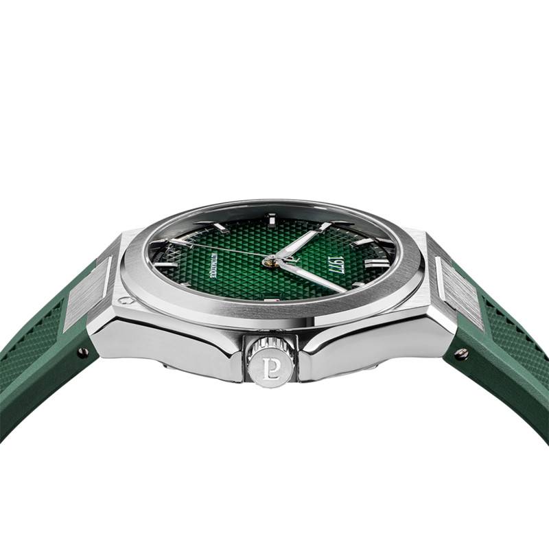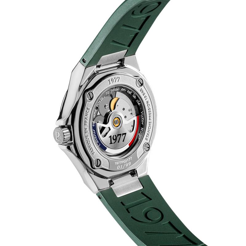 La montre est accompagnée d'un bracelet en caoutchouc vert, qui allie confort, souplesse et résistance. Grâce à sa largeur d'entrecorne de 23 mm, il s'adapte parfaitement au poignet, assurant une sensation de légèreté et de flexibilité. Le fermoir avec une boucle déployante papillon permet une mise en place aisée tout en garantissant une sécurité optimale.