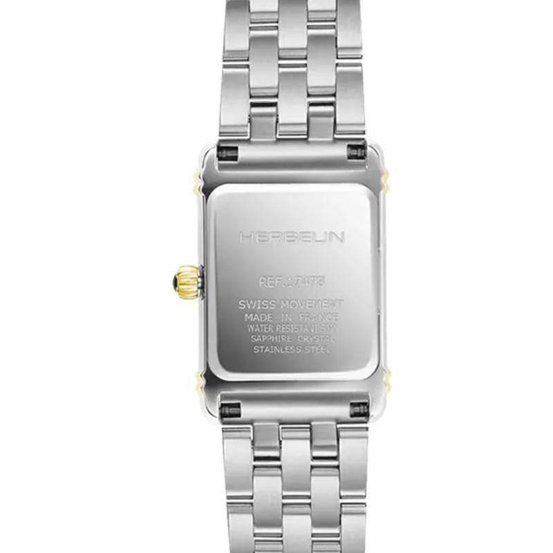 Fondée en France en 1947, la maison Michel Herbelin se réinvente pour vous proposer des créations horlogères au charme toujours plus remarquable. Cette montre 17478BT59, destinée à la gente féminine, est issue de la collection Art Déco. Elle se pare d'un boîtier de forme rectangulaire d'une longueur de 24,40mm pour une largeur de 20,30mm, et une épaisseur de 6.15mm. Conçu en acier inoxydable 316L, il est bicolore, argenté et PVD doré qui apporte au bijou un style vintage et élégant. Le cadran blanc nacré est surplombé d'un verre saphir très résistant face aux chocs et aux rayures éventuelles du quotidien. Afin de disposer facilement des éléments du cadran, une couronne remontoir se dresse à trois heures. Finalement, le fond de boîtier de cette montre est maintenu par des vis, et lui permet de rester étanche jusqu'à 5 atmosphères.