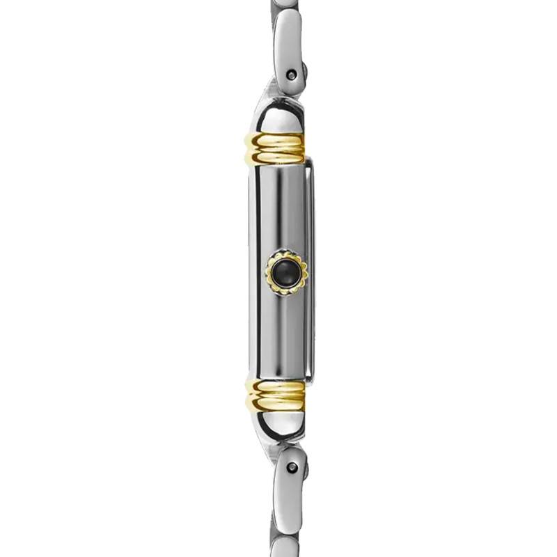 En complète harmonie avec le design classique de ce garde-temps, son bracelet est fabriqué en d'acier inoxydable bicolore. Ses cinq rangées de maillons à la finition polis vous apporteront confort et maintien au fil des jours, alternant parfaitement les teintes argentées et dorées. Muni d'une fermeture à boucle déployante papillon, ce bracelet épousera avec élégance les courbes de votre poignet féminin.
