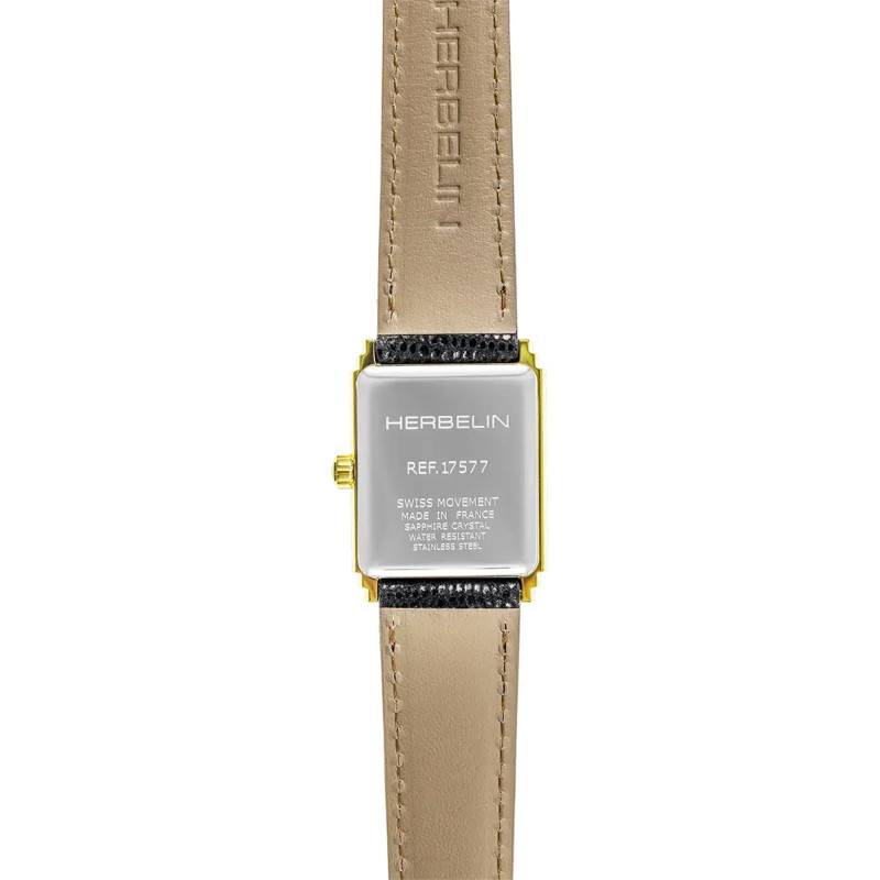 Michel Herbelin vient agrandir sa collection Art Déco 1925's avec le modèle 17577P04N ! Ce garde-temps à l'allure singulière qui n'a pour égal que celle des années folles, se pare d'un boîtier de forme rectangulaire en PVD Plaqué Or Jaune de 22x29,5mm, protégé par un verre saphir et d'une couronne délicate du même ton. Avec le sens du détail dont sait faire preuve la maison horlogère française, cette pièce étanche jusqu'à 30 mètres, soit 3 ATM s'impose déjà comme la parfaite compagne pour un poignet féminin!