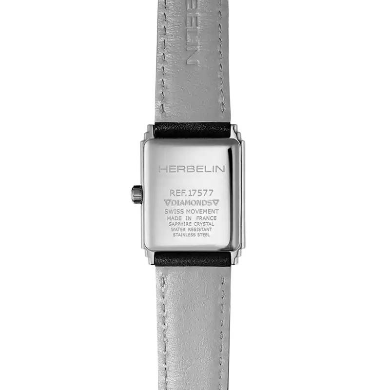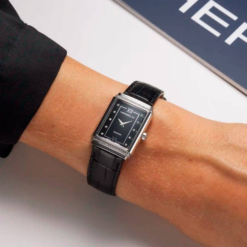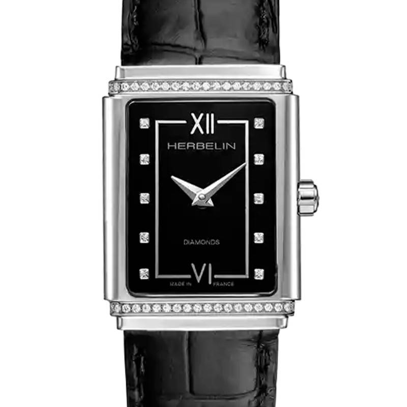 La montre Herbelin de la collection Michel Herbelin Art Déco incarne le savoir-faire horloger français avec une touche de sophistication joaillière. Conçue pour les femmes qui apprécient l'élégance intemporelle, cette montre représente un chef-d'œuvre de précision et de design. Le boîtier rectangulaire mesure 29,50 mm de longueur et 22,00 mm de largeur, présentant une silhouette élégante qui se pose avec finesse sur le poignet. Fabriqué en acier inoxydable 316L, connu pour sa robustesse et sa résistance à la corrosion, le boîtier se distingue par sa finition polie et diamantée. À seulement 6,40 mm d'épaisseur et pesant 23 grammes, la montre offre légèreté et confort tout en ajoutant une touche de luxe subtil grâce à ses véritables diamants sertis sur le boîtier. Fabriquée en France, elle est le reflet d'un savoir-faire minutieux et d'un design inspiré des années 20, rendant hommage à l'esthétique géométrique de l'époque tout en intégrant des éléments modernes.