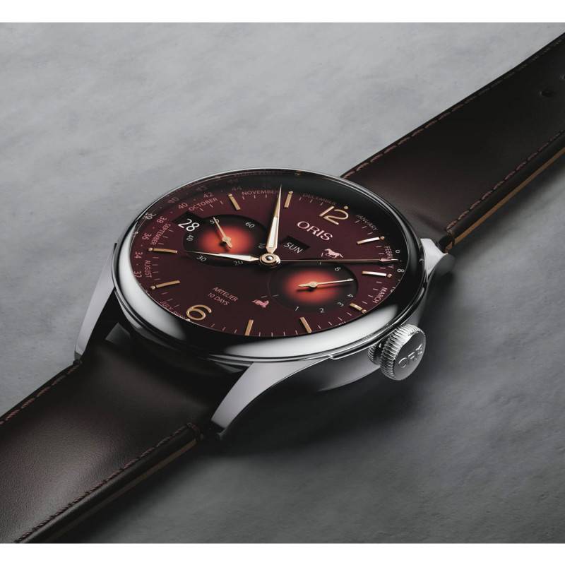 Le cadran de la montre Oris Artelier est conçu comme un chef-d’œuvre de subtilité et de détails. Arborant un dégradé de rouge captivant, il confère à l'ensemble une profondeur visuelle envoûtante. Les aiguilles luminescentes, se détachent élégamment sur ce fond aux tonalités riches, facilitant une lecture aisée de l'heure. Les index sont finement disposés, accompagnés d’un chemin de fer précis pour indiquer les minutes. Deux guichets additionnels pour le jour et la date prennent place, ajoutant à la fonctionnalité du cadran sans aucune surcharge visuelle. L’attention portée à sa conception permet de fusionner des traits modernes avec une influence vintage incroyablement harmonieuse.
