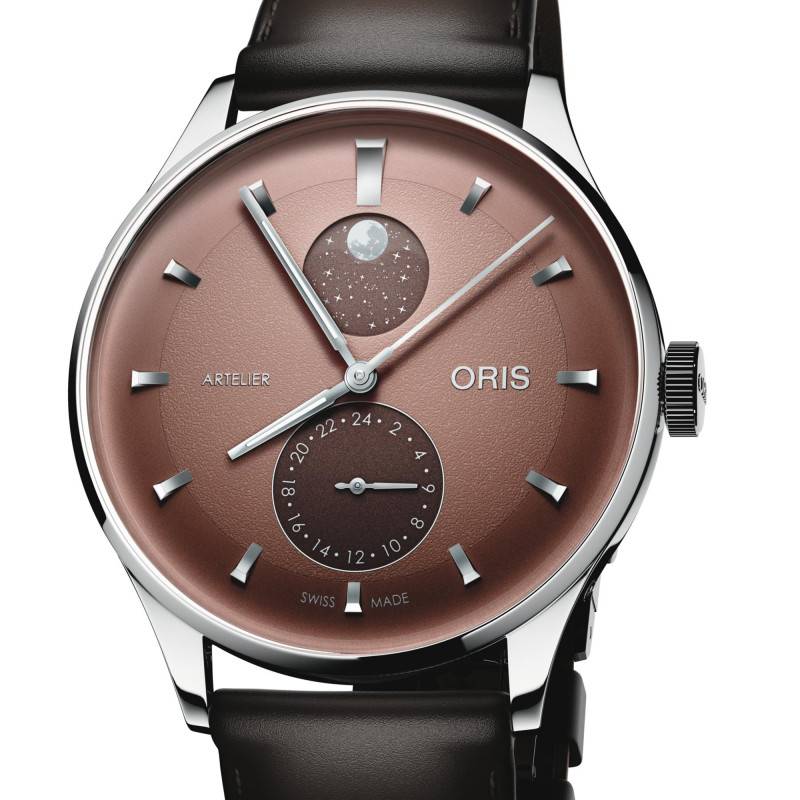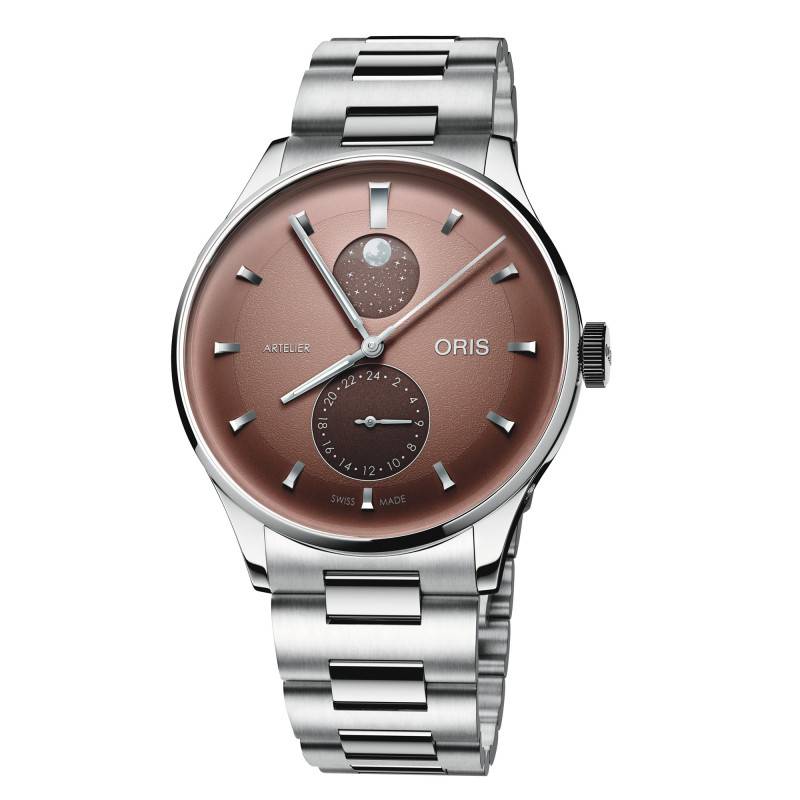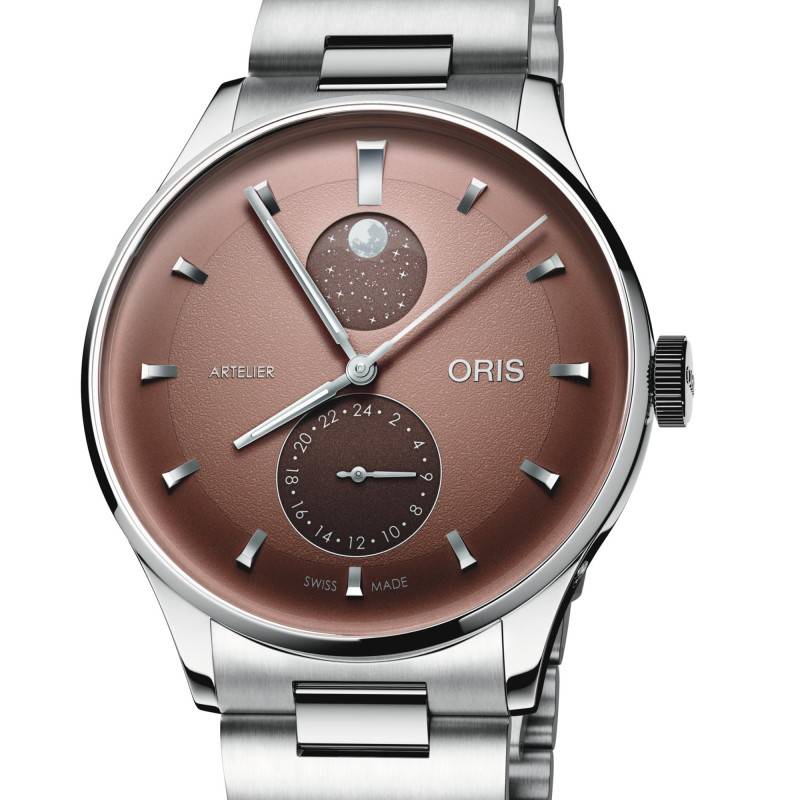 Le cadran de cette montre est de couleur marron texturé offrant une profondeur et une sophistication visuelle. Au centre, les aiguilles sont dotées d’un traitement SuperLuminova, assurant une lisibilité optimale même dans l’obscurité. Un compteur 24 heures est intégré, apportant une fonctionnalité supplémentaire. La présence d'une phase de lune ajoute une dimension supplémentaire. Les index, clairement marqués, permettent une lecture facile et rapide de l’heure. Protégé par un verre bombé en saphir avec un traitement antireflets, le cadran peut être observé à travers une grande clarté.