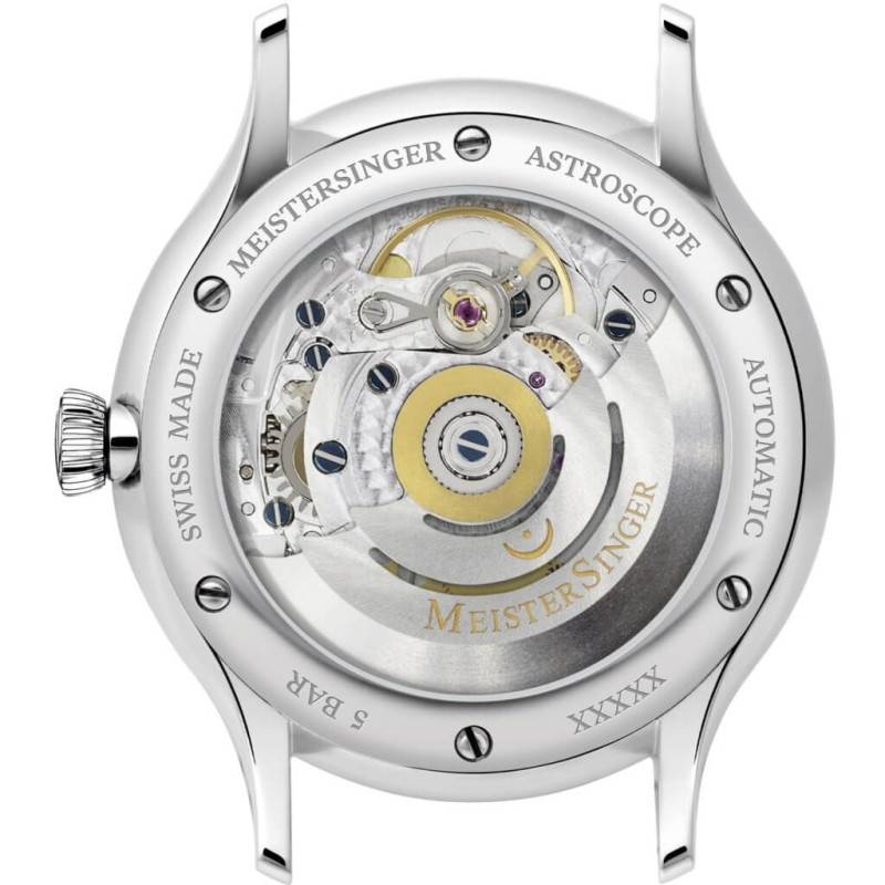 La maison horlogère Meistersinger vous dévoile une nouvelle innovation allemande au cœur de ce somptueux modèle de sa nouvelle collection Astroscope. Fort de son savoir-faire depuis 2001 par son concept de mono-aiguille, la marque vous plongera dans l'univers astronomique et antique à travers une nouvelle complication horlogère. Cette dernière est en accord avec sa typologie d'affichage analogique qui s'inspire des premiers cadrans solaires. Elle met une nouvelle fois à l'honneur le plaisir du temps qui passe. Empreinte d'une élégance intemporelle, ce boîtier en acier inoxydable de forme ronde affiche des dimensions résolument masculines avec un diamètre de 40 mm pour une épaisseur de 10,5 mm. Finesse et modernité se retrouvent également sur sa lunette fixe et polie où est placée une couronne remontoir qui vous sera utile pour gérer l'aiguille et le guichet date. De plus, son cadran est pourvu d'un verre saphir bombé qui garantira sa protection contre les rayures et chocs du quotidien. Finalement, son fond de boîte est fixé à l'aide de six vis et vous laissera entrevoir les oscillations de la masse oscillante. Ce fond de boîtier transparent est doté d'un verre minéral, matière reconnue dans l'univers horloger pour sa haute robustesse.