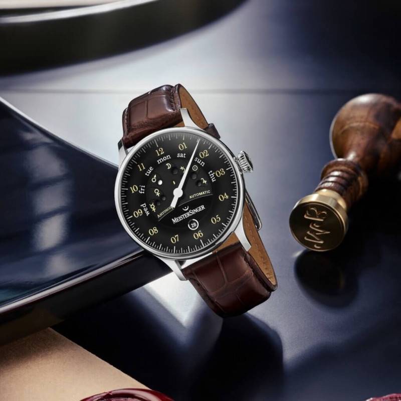Le style d'un modèle MeisterSinger se reconnaît à travers son aiguille iconique placée au cœur du cadran au fond noir. Elle se situe au centre de ce premier cercle aux multiples facettes. De couleur blanche, elle vous permettra de lire l'heure sous un format de 12 heures. Les index blancs et le chemin de fer situés sur le pourtour du cadran vous indiqueront les heures et les minutes. Afin de lire l'heure avec la mono-aiguille, vous devrez prendre en compte les tranches de 5 minutes. De plus, afin que vous vous repériez quotidiennement, vous retrouverez un guichet date situé à 6 heures. En astrologie, pour donner un rythme au temps, les planètes sont agencées en cycles de semaines de 7 jours. De ce fait chaque jour de la semaine est lié à un corps céleste. Ainsi, vous retrouverez sur le pourtour du cercle central, les jours de la semaine en anglais avec en face le symbole du corps céleste associé. Vous retrouverez ci-dessous l'attribution des jours de la semaine aux corps célestes :