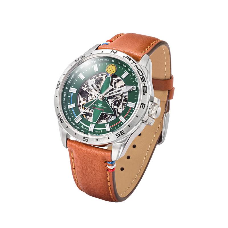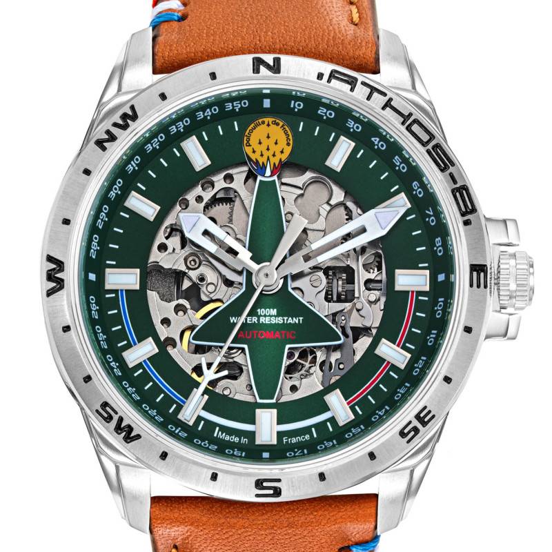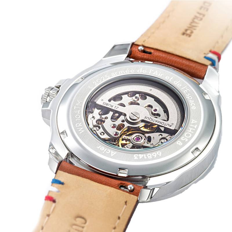 La montre Patrouille de France Athos 8 A8-100ED-668143 arbore une allure audacieuse et sophistiquée. Dotée d'un boîtier rond en acier inoxydable, elle se distingue par ses proportions généreuses, avec un diamètre de 44 mm et une épaisseur de 12,80 mm. Le boîtier offre une finition exceptionnelle qui exprime à la fois la tradition et la modernité, signature de l'expertise horlogère française. Le choix de l'acier inoxydable assure non seulement une robustesse à toute épreuve, mais également une résistance à la corrosion, préservant ainsi l'éclat de la montre au fil du temps. Le fond de boîte transparent et vissé permet d'admirer librement le cœur du mécanisme, renforçant l'expérience visuelle offerte par la montre. De plus, la présence d'une lunette fixe à gravure directionnelle ajoute une dimension utilitaire et esthétique à ce garde-temps d'exception.