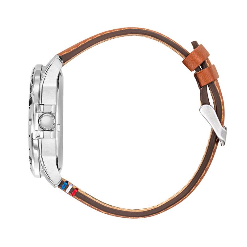 Le bracelet de cette montre est conçu en cuir de vachette marron, qui complète harmonieusement le boîtier en acier pour un look à la fois raffiné et robuste. La surpiqûre contrastée ajoute une touche d'élégance, mettant en avant le savoir-faire artisanal dédié à la confection de ce bracelet. Avec une largeur de 22 mm à l'entrecorne, il assure stabilité et confort sans compromis pour le porteur. Le dispositif de fermeture est une boucle ardillon, une solution classique qui garantit une sécurité et un ajustement parfait au poignet.