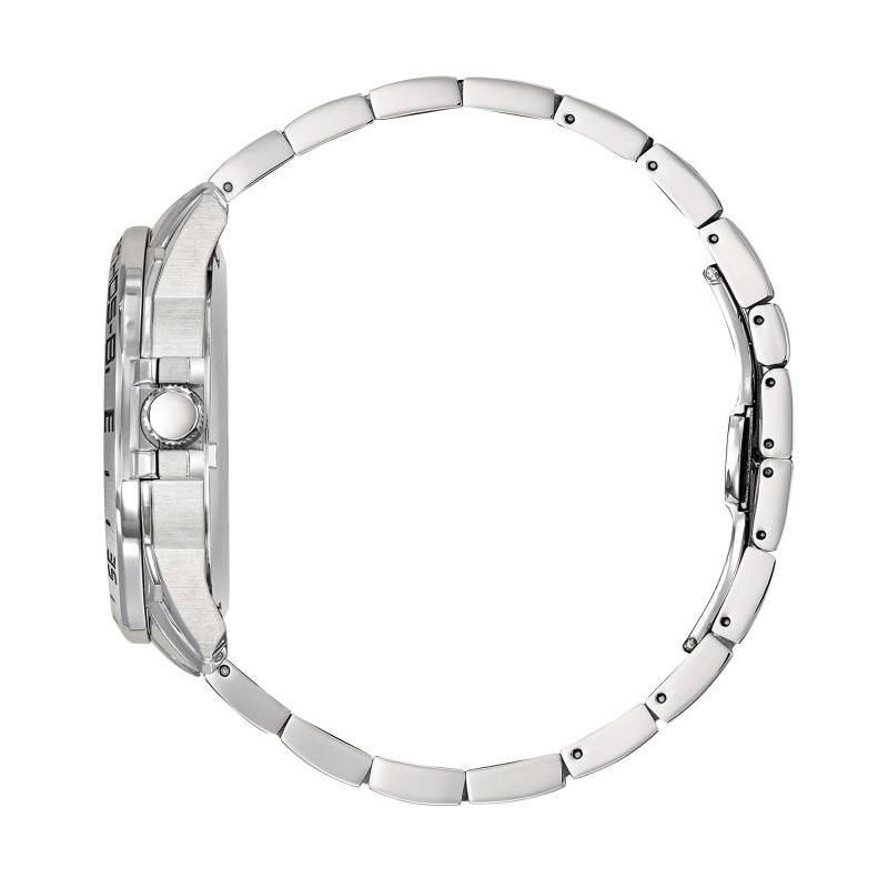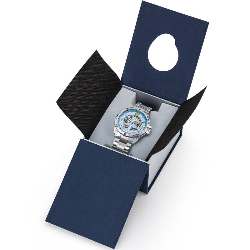 Le bracelet en acier complète parfaitement l'élégance de cette montre. Subtilement fusionné à l'ensemble, il affiche une finition polie et brossée, reflétant la lumière de manière flatteuse tout en demeurant modérément discrète. La couleur grise accentue l'allure sophistiquée, sans détourner l'attention du majestueux cadran. Avec une largeur d'entrecorne de 22 mm, ce bracelet offre une présence solide mais confortable, assurant que la montre reste bien positionnée au poignet. Le fermoir à boucle déployante souligne la praticité et le confort, permettant un ajustement sécurisé qui s'enclenche facilement tout en offrant une ouverture rapide.