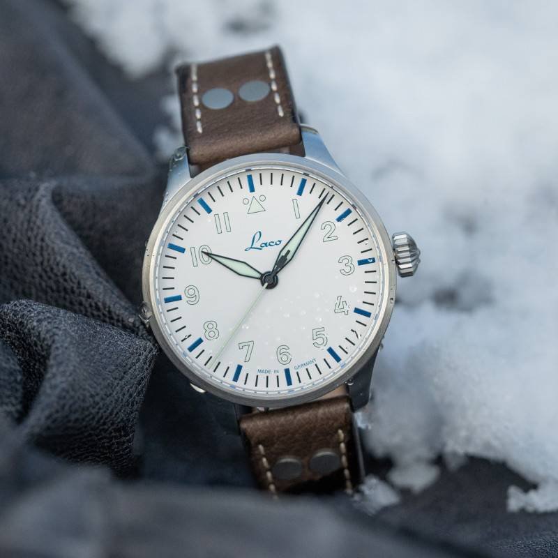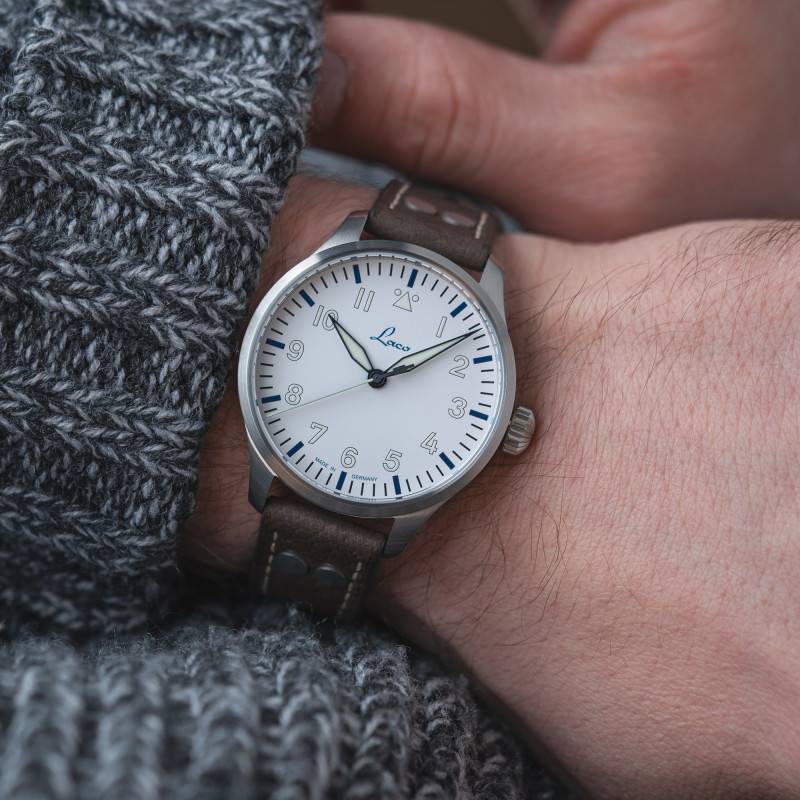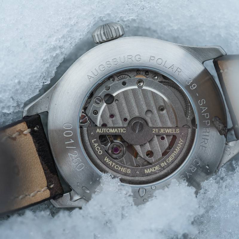 La montre Augsburg Polar 39 de Laco se distingue par son esthétique à la fois classique et robuste. Conçue pour les hommes, elle incarne l'élégance intemporelle avec un boîtier en acier inoxydable, mesurant 39 mm de diamètre, idéal pour s'adapter confortablement à n'importe quel poignet masculin. Cette montre est proposé en édition limité en 250 exemplaires. Son épaisseur de 11,5 mm lui confère une présence indiscutable tout en restant discrète sous une manchette. La forme ronde du boîtier accentue son allure classique, parfait mariage entre tradition et modernité.Le fond de boîte emboîté, avec une transparence qui laisse entrevoir le mouvement complexe, offre une touche sophistiquée, témoignage du savoir-faire allemand réputé de la fabrication.