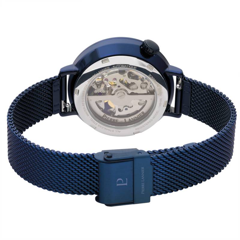 C'est un bracelet en acier inoxydable poli qui vient compléter le design de cette montre. De finition maille milanaise et arborant une belle teinte bleue, il se marie parfaitement au reste du modèle. Affichant 14 mm de largeur d'entre-corne, il se ferme grâce à une boucle coulissante.