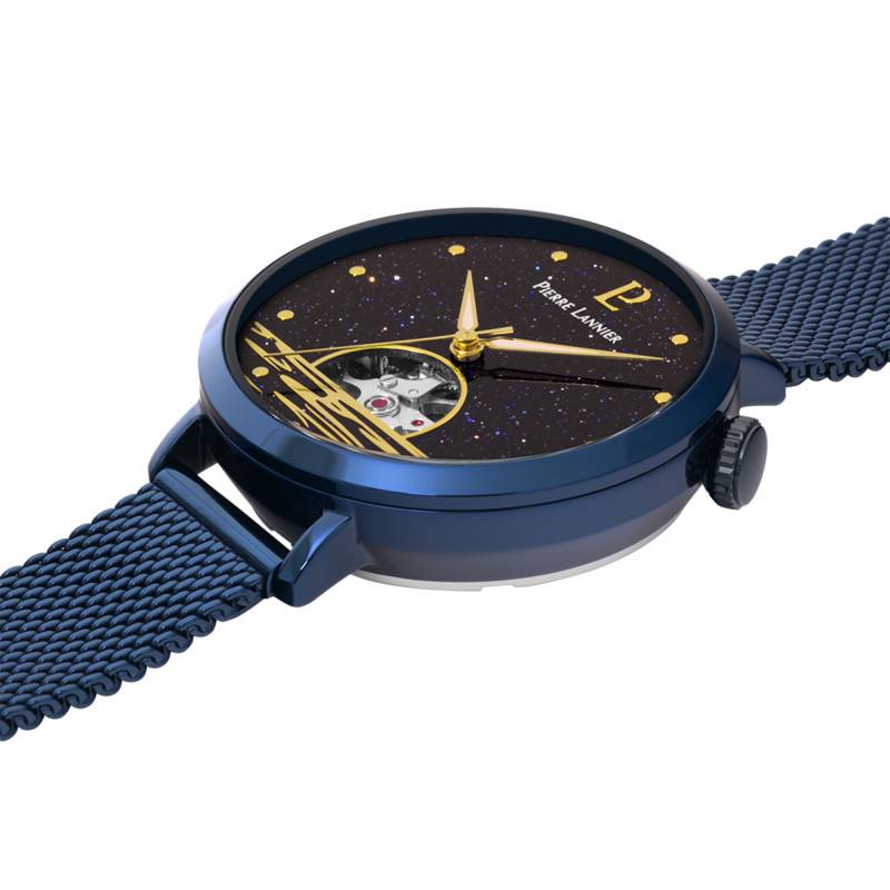 Pierre Lannier est une marque française qui a su se démarquer en proposant des modèles uniques et travaillés par des artisans hautement certifiés. Au fil des temps, elle a pu se classer parmi les marques de renom et sublime les poignets d'hommes et de femmes avec des créations hors du commun. Aujourd'hui, elle vous présente à travers sa nouvelle collection Australe la montre 148H866 qui ne manquera pas de vous plonger dans un univers astral. Elle arbore un magnifique boîtier conçu en acier inoxydable de finition polie et arborant une belle couleur bleue mesurant 35 mm de diamètre, 12,50 mm d'épaisseur et disposant d'un poids léger de 77 gr. Pensée pour les femmes en quête de garde-temps distingué, elle saura vous accompagner dans la lecture du temps tout en embellissant votre allure. Un verre minéral recouvre sa surface et assure une vue imprenable sur les éléments du cadran et vous trouverez à 2 heures une couronne crantée en forme de citrouille assurant une prise de main aisée. Enfin, son fond de boîte lui assure une étanchéité de 5 ATM.