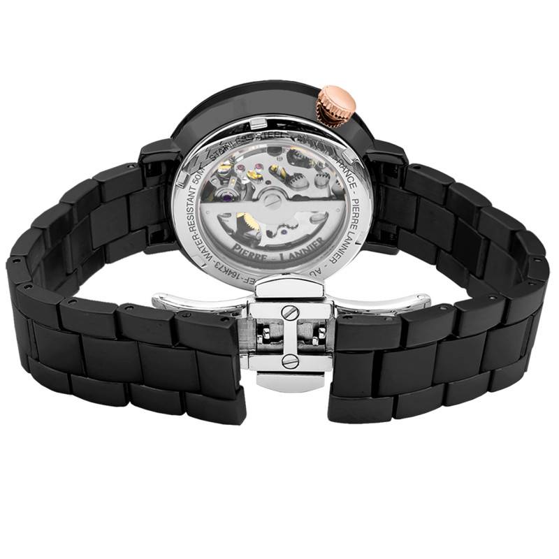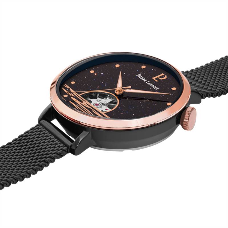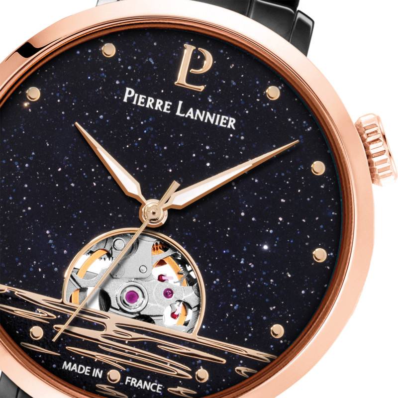 D'origine française, Pierre Lannier a su se distinguer en proposant des modèles réalisés par des artisans dévoués et hautement qualifiés. Avec le temps, elle a réussi à se positionner parmi les marques de renommée qui subliment les poignets des hommes et des femmes amoureux de l'élégance. Toujours sur cette lancée, elle vous présente sa toute nouvelle gamme qui vous emmènera sans aucun doute dans un monde astral. Il s'agit de l'australe qui comprend des montres aux cadrans émaillés de fines particules rappelant les étoiles dans un ciel nocturne. Dans cette collection, vous trouverez le modèle 149K739 pensé pour les femmes. Il se pare d'un boîtier rond conçu en acier inoxydable poli mesurant 35 mm de diamètre, 12,50 mm d'épaisseur et disposant d'un poids léger de 89 gr. Mis en avant par une lunette rose dorée, il saura mettre en valeur votre poignet tout en vous communiquant le temps avec facilité. Sa surface est recouverte d'un verre minéral qui permet une vision parfaite des éléments du cadran et vous remarquerez à 2 heures une couronne crantée assurant le réglage des éléments centraux. Enfin, le fond de cette montre lui assure une étanchéité de 3 ATM.