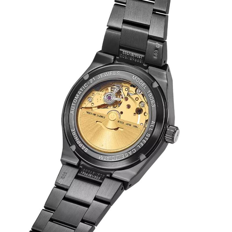 Au cœur de cette montre se trouve un mouvement Miyota 8215, un exemple brillant de l'horlogerie japonaise de précision. Le mécanisme automatique fonctionne à une fréquence de 21.600 alternances par heure, garantissant une mesure du temps de qualité. Avec une réserve de marche de 42 heures, cette montre reste fonctionnelle même après une journée sans être portée. Le mouvement est visible à travers le fond de boîte transparent, offrant un spectacle fascinant du va-et-vient de la masse oscillante qui alimente le calibre.