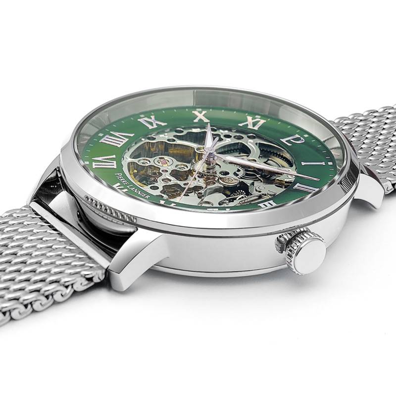 En plus d'être captivant et élégant, le cadran qui pare ce modèle vous assure une lecture facile du temps. Il arbore une splendide couleur verte au fini soleillé sur les bords et présente en son centre une finition squelette pour un résultat des plus saisissants. Sa bordure est longée par un chemin de fer des minutes qui entoure des chiffres romains gris qui vous serviront de repère pour lire les heures avec précision. Ces éléments sont survolés par deux aiguilles luminescentes qui vous indiqueront avec précision les heures et les minutes. Elles sont accompagnées dans leur course par une trotteuse chargée de communiquer les secondes. Pour clore ce cadran en beauté, la marque signe sa création avec son logo à midi et place son nom ainsi que l'origine à 6 heures.