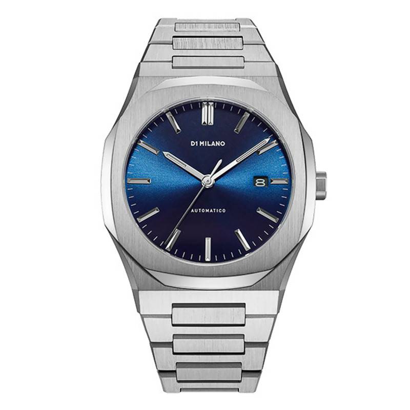 La marque D1 Milano vous dévoile une collection de montres automatiques très élégante et originale. Elle arbore un boîtier en acier inoxydable brossé d'une originale forme octogonale qui saura vous séduire au premier regard. Celui-ci mesure 41,5 mm de diamètre pour une épaisseur de 9,8 mm. De plus, la lunette fixe de même que la couronne vissée sont en acier inoxydable de couleur grise et disposent de cette originale forme octogonale. Un solide verre saphir vient protéger son cadran ainsi que les éléments qu'il contient contre les chocs et les rayures du quotidien. Ce verre réputé en horlogerie pour sa robustesse fait de ce garde-temps un compagnon idéal pour vous. De plus, il est traité antireflets pour vous offrir une parfaite visibilité des éléments qu'il protège. Enfin, le fond de boîte est transparent et maintenu par 6 vis assurant une étanchéité de 5 atmosphères. Ce fond vous permettra d'admirer le mécanisme automatique de cette montre dans toute sa splendeur.