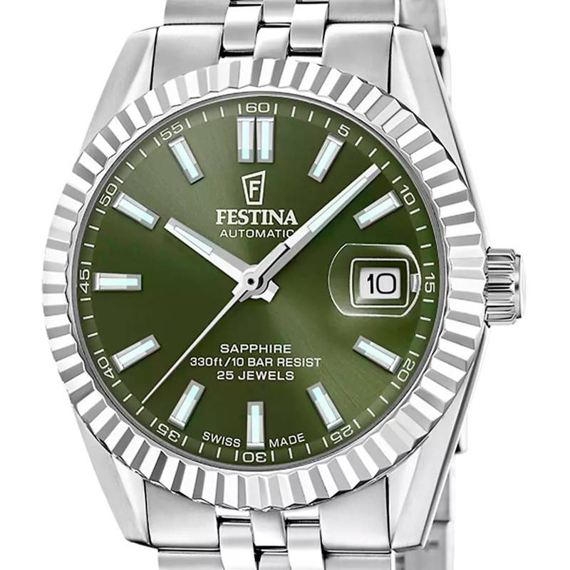 Le cadran de cette montre Festina est un véritable atout esthétique et fonctionnel. De couleur verte avec une finition soleillée, il capture la lumière de manière élégante, créant un effet visuel captivant qui évoque subtilement la nature. Les index sont disposés avec précision, complétés par un chemin de fer qui facilite la lecture des minutes. Les aiguilles luminescentes garantissent une lisibilité optimale même en conditions de faible luminosité. Les chiffres arabes ajoutent une touche moderne, facilitant ainsi la lecture de l'heure. Un guichet date situé à 3 heures offre une fonctionnalité pratique indispensable pour le quotidien. Le verre saphir qui recouvre le cadran assure une résistance exceptionnelle aux rayures, maintenant ainsi la clarté et la beauté du cadran au fil du temps.