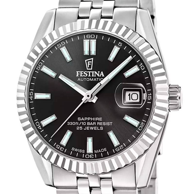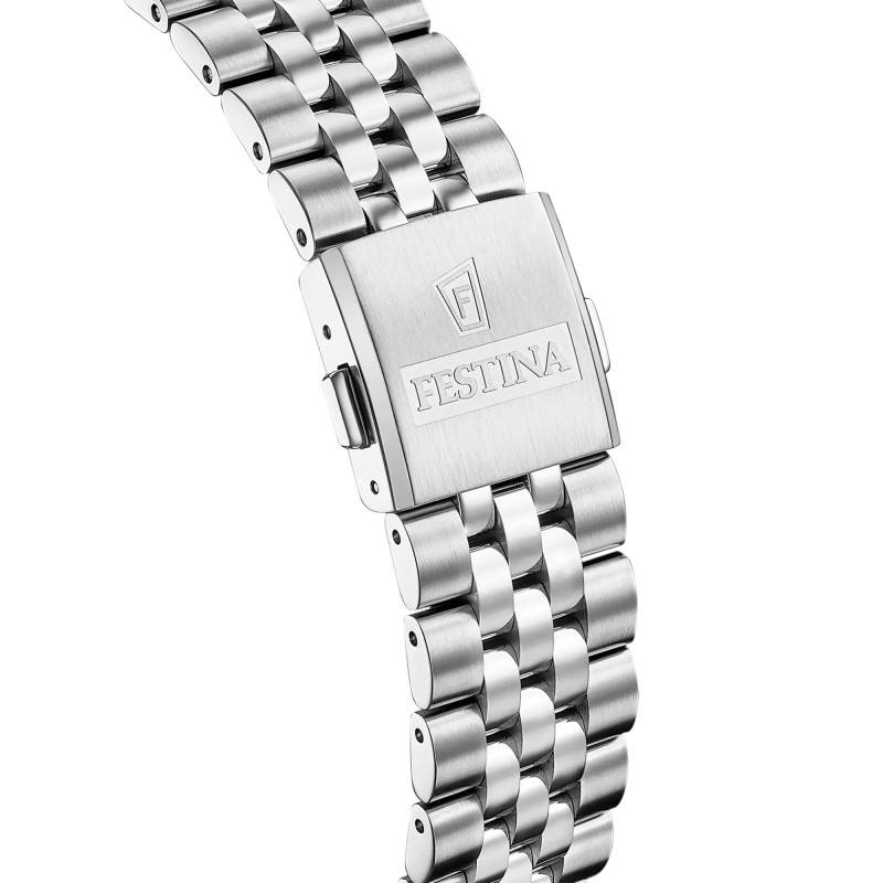La montre Festina Swiss Made se distingue par un équilibre parfait entre élégance et fonctionnalité. Son boîtier rond, mesurant 41 mm de diamètre et 10,75 mm d'épaisseur, est taillé dans un acier inoxydable 316 L. La finition polie et brillante du boîtier lui confère une allure sophistiquée. Le poids total de 157 g assure une présence affirmée au poignet, tandis que le fond de la montre est transparent et vissé, permettant d'admirer le mécanisme en action tout en garantissant une étanchéité remarquable. La couronne discrètement positionnée simplifie le réglage de l'heure et de la date. Le verre saphir plat, reconnu pour sa robustesse inégalée, protège efficacement le cadran tout en préservant sa clarté.