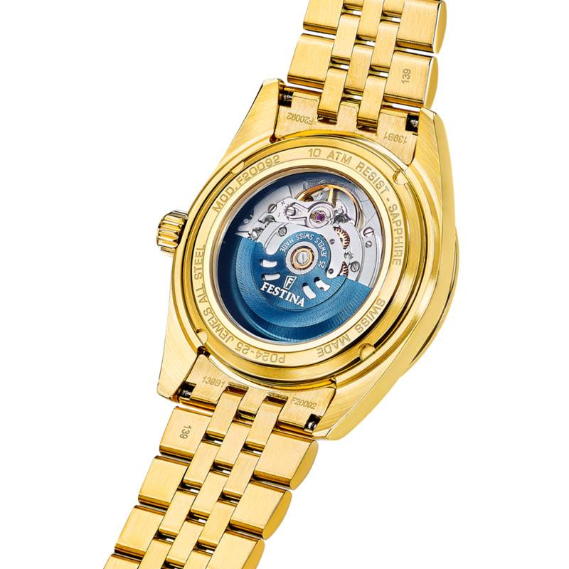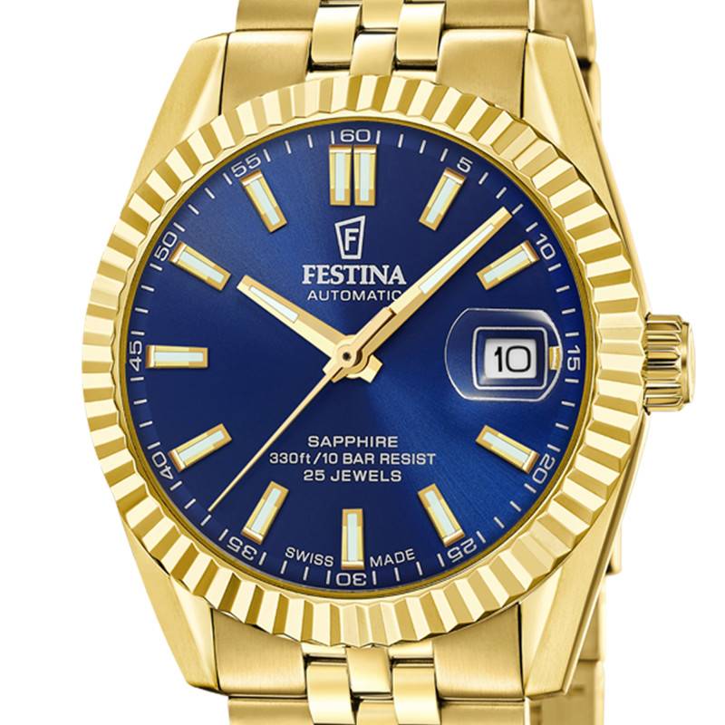La montre Festina Swiss Made symbolise l'élégance et la qualité suisse à travers un design à la fois moderne et intemporel. La structure ronde du boîtier, fabriquée en acier inoxydable 316L, se distingue par sa robustesse et sa résistance à la corrosion. Avec un diamètre de 41,00 mm et une épaisseur de 10,75 mm, elle épouse parfaitement le poignet, offrant un confort optimal sans compromettre l'élégance. Le choix du verre saphir utilisé pour cette montre de qualité, plat par nature, assure une excellente protection contre les égratignures. L'attrait esthétique de la montre est accentué par une lunette en acier inoxydable à finition polie qui ajoute un éclat sublime à l'ensemble. On notera également l'intérêt particulier du fond de boîte transparent et vissé qui permet d'admirer le mouvement complexe de ce garde-temps.