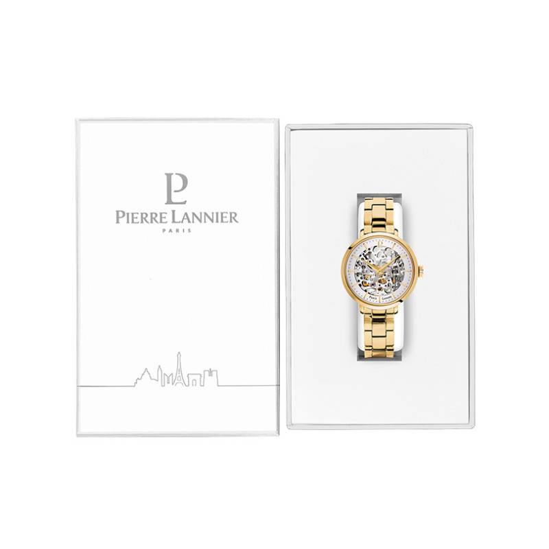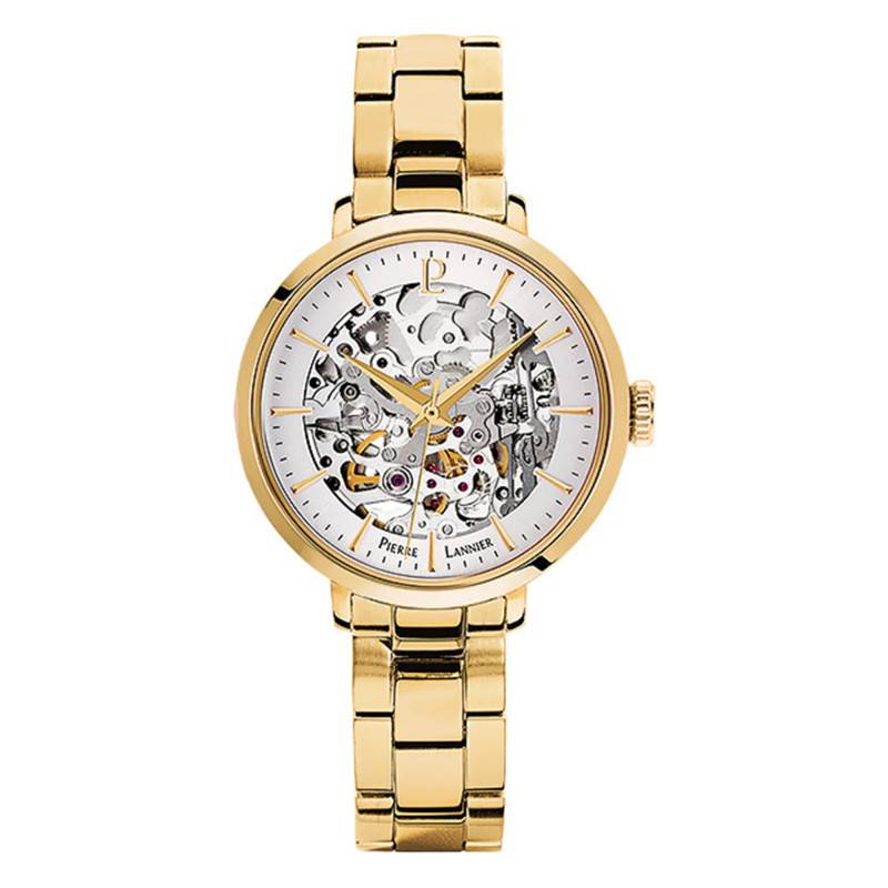 Pierre Lannier vous dévoile sa montre automatique féminine. Cette pièce dispose d'un boîtier en acier inoxydable sublimé par un PVD jaune gold. Le diamètre de 35 mm et l'épaisseur de boîtier de 12,15 mm habilleront parfaitement les poignets féminins. Un verre minéral est posé sur ce boîtier afin de protéger votre cadran des risques quotidiens. Une discrète couronne remontoir se glisse à 3 h afin de vous permettre de remonter vos aiguilles. Léger et agréable à porter, votre bijou ne pèse que 94 grammes. Le fond de boîte vissé transparent vous permettra à la fois d'admirer votre mécanisme automatique, tout en assurant l'étanchéité de 3 ATM à votre bijou.