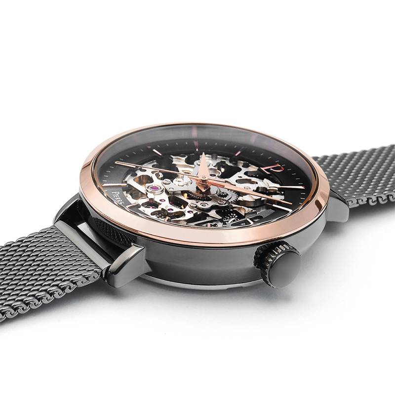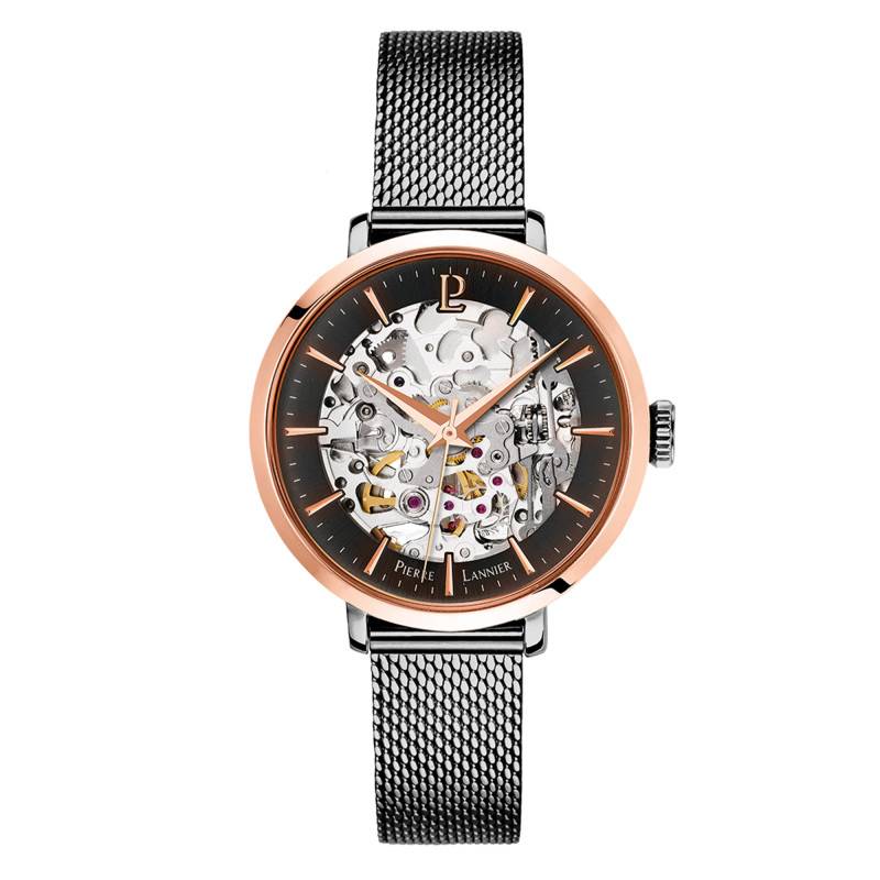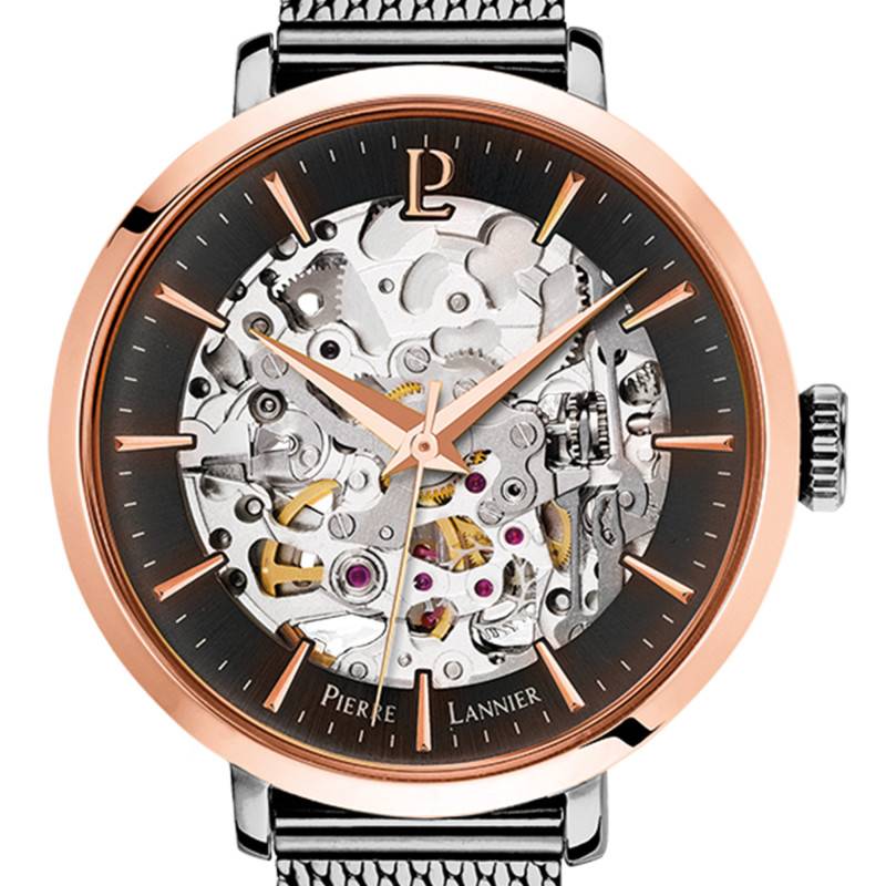Ce nouveau modèle possède un cadran squelette. Vous noterez qu'il est partiellement absent afin de laisser voir les parties mécaniques du mouvement automatique. Un délicat contour noir héberge un discret chemin de fer conformé de petits traits, accompagné des index bâtons en PVD or rose. Les aiguilles des heures et des minutes ainsi que la trotteuse arborent cette même couleur complétant un look très féminin. Le logo de la marque, une lettre "P" majuscule remplace l'index placé à 12 heures. Finalement, la maison française appose son nom à 6 heures.
