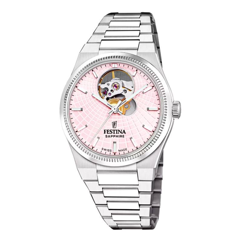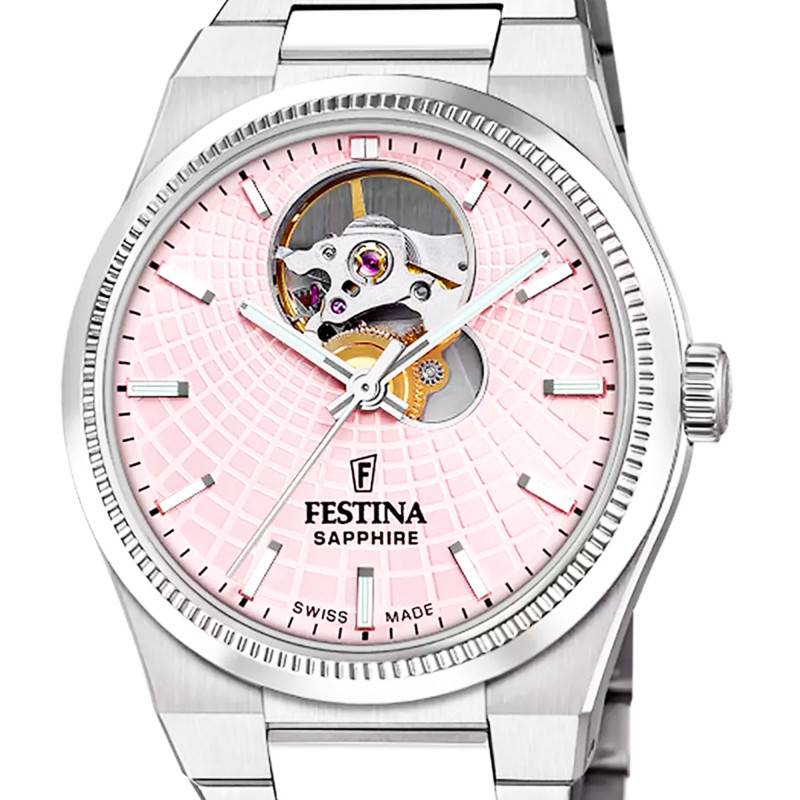 Le cadran de cette Festina est un chef-d'œuvre de finesse et de précision. Arborant une finition guillochée avec un cœur ouvert, il laisse transparaître le mouvement automatique de la montre. Les index minutieusement peints complètent un chemin de fer des minutes, créant une lisibilité incomparable. Tout cela est protégé par un verre saphir traité anti-reflet, promettant une vision claire sous tous les angles et conditions de lumière.