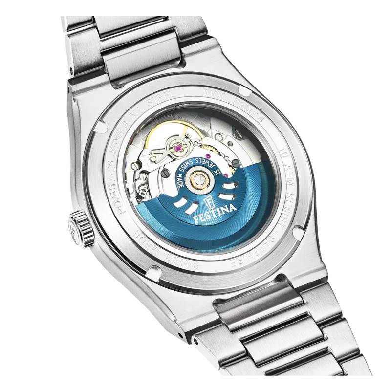 Le cœur battant de cette montre Festina, le mouvement automatique suisse P024, est conçu pour offrir précision et fiabilité. Ce calibre assure les fonctions essentielles d'affichage des heures, minutes et secondes, le tout avec une fluidité et une exactitude remarquables. Le mouvement est visible à travers le fond transparent, où vous pouvez admirer la masse oscillante en œuvre.