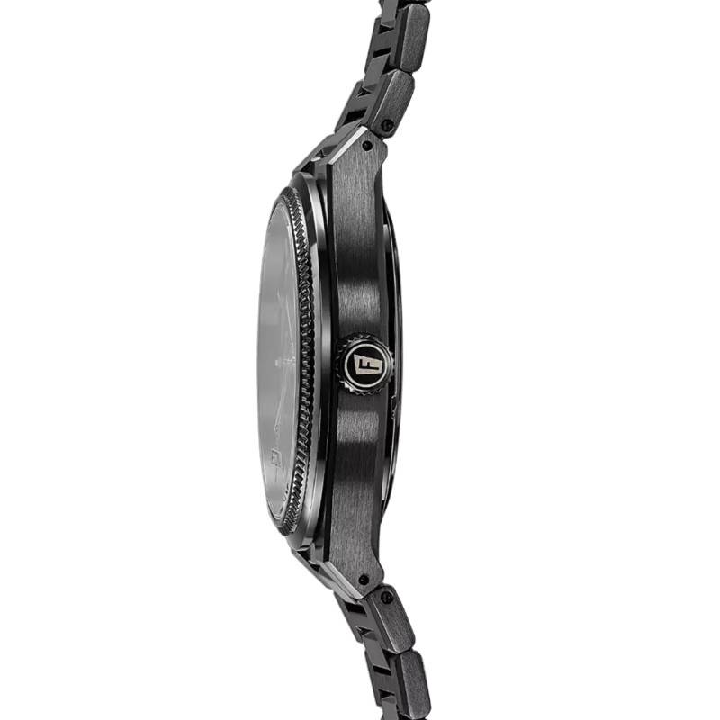 Le bracelet, véritable prolongement du boîtier, est fabriqué en acier inoxydable, parfaitement coordonné à la couleur noire du boîtier. Sa finition brossée associée à des éléments polis procure une texture agréable et une apparence sophistiquée. Sa boucle déployante assure non seulement un maintien sécurisé mais aussi un confort inégalé lors de son port quotidien.