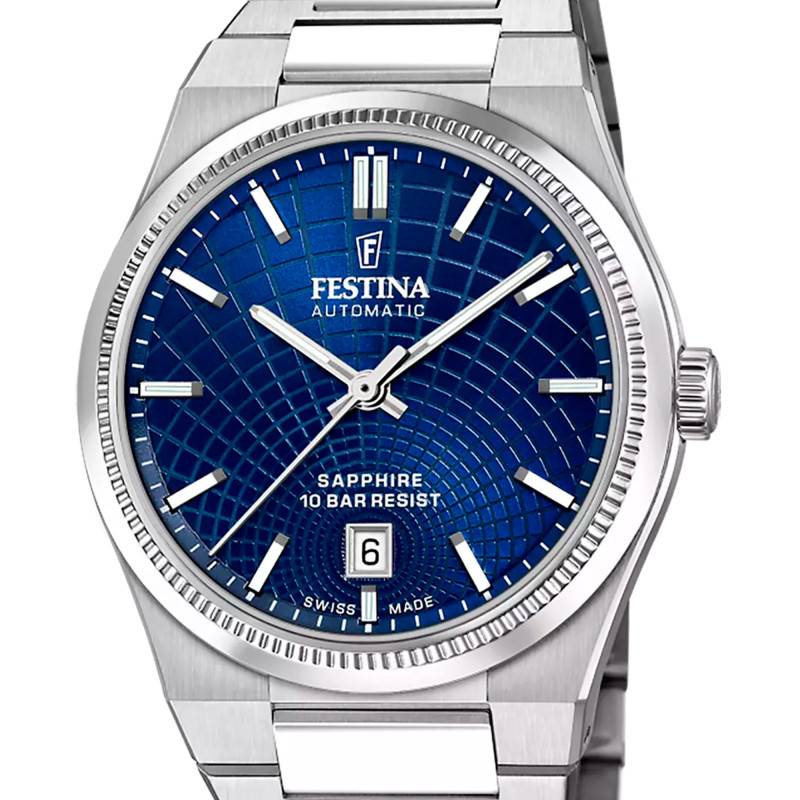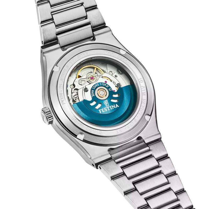 Cette montre Festina Swiss Made est une illustration parfaite de l'artisanat suisse à son meilleur. Son boîtier rond est réalisé en acier inoxydable 316L, un matériau reconnu pour sa robustesse et sa résistance à la corrosion. Avec ses dimensions harmonieuses, un diamètre de 40,00 mm et une épaisseur de 10,70 mm, elle s'adapte confortablement au poignet, tout en affichant une allure élégante et contemporaine. La lunette cannelée apporte une touche d'élégance sophistiquée, amplifiée par le contraste entre les finitions mat et polie. Le fond de la boîte est transparent et vissé, permettant d'admirer le mouvement en action, une caractéristique qui ne manquera pas de séduire les amateurs de garde-temps mécaniques. La protection est assurée par un verre saphir plat, réputé pour sa résistance aux rayures, garantissant ainsi une lisibilité optimale et une durabilité accrue.