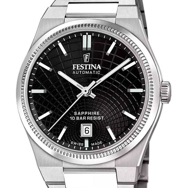 La Festina Swiss Made Automatic se distingue par son design à la fois moderne et classique. Conçue pour l'homme contemporain, elle réunit élégance et performance grâce à son boîtier rond en acier inoxydable 316L. La montre est soigneusement travaillée avec des finitions mates (brossées/satinées) et brillantes, ce qui lui confère un éclat subtil sans être ostentatoire. Sa taille, avec un diamètre de 40 mm et une épaisseur de 10,70 mm, est idéale pour convenir à tous les poignets, offrant confort et style. La lunette cannelée ajoute une dimension supplémentaire à sa silhouette intemporelle. Pour les amateurs de détails esthétiques, la montre dispose d'une couronne discrète et bien intégrée permettant un réglage aisé de l'heure et de la date. Enfin, le verre saphir plat protège le cadran tout en exposant clairement chaque détail.