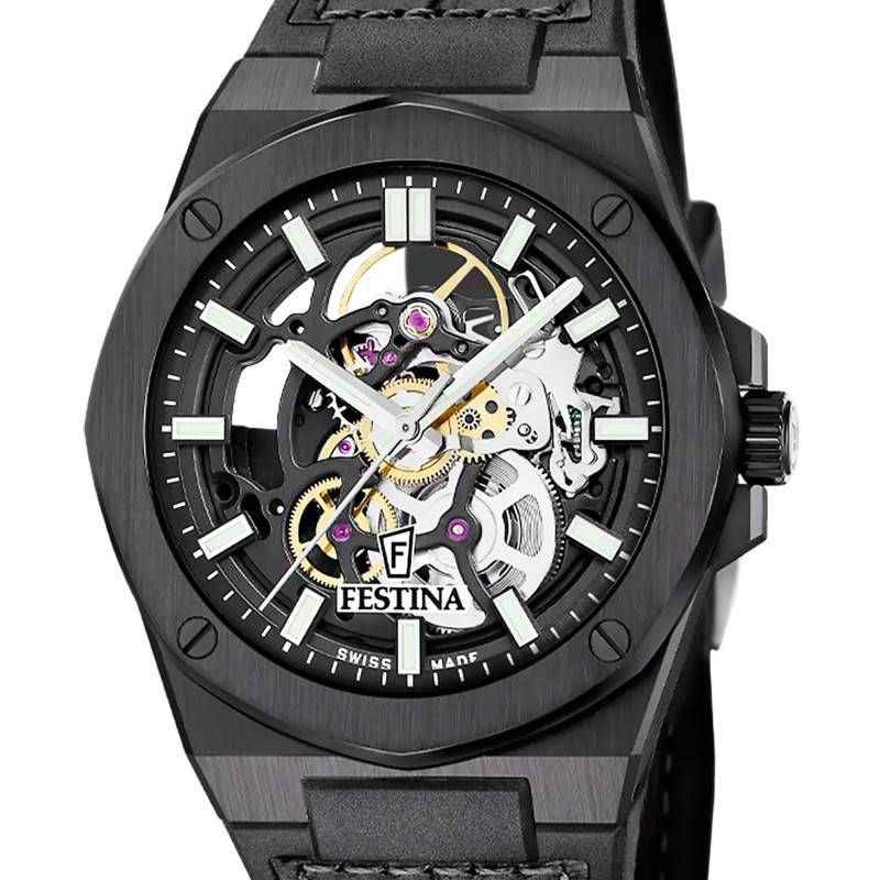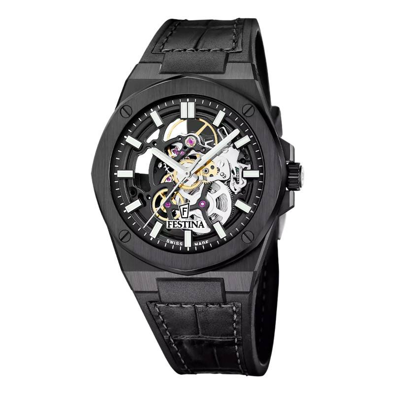 Le cadran de la Festina Swiss Made est un véritable chef-d'œuvre de finesse et de technique, avec une finition squelette qui dévoile les rouages du mouvement automatique. Les index apportent une lisibilité immédiate et nette des indications de temps, intégrées à un chemin de fer des minutes subtil qui assure une précision de lecture. La trotteuse, tout comme les aiguilles des heures et des minutes, évoque une danse harmonieuse sur ce fond transparent.