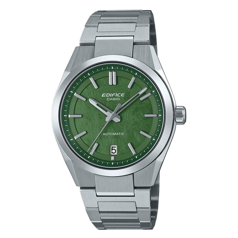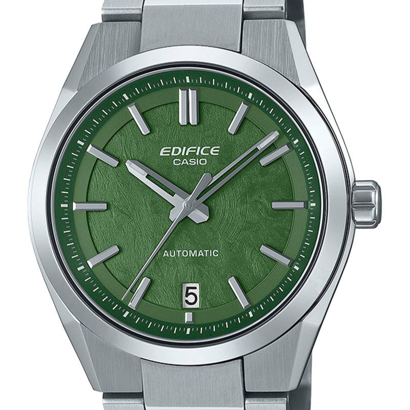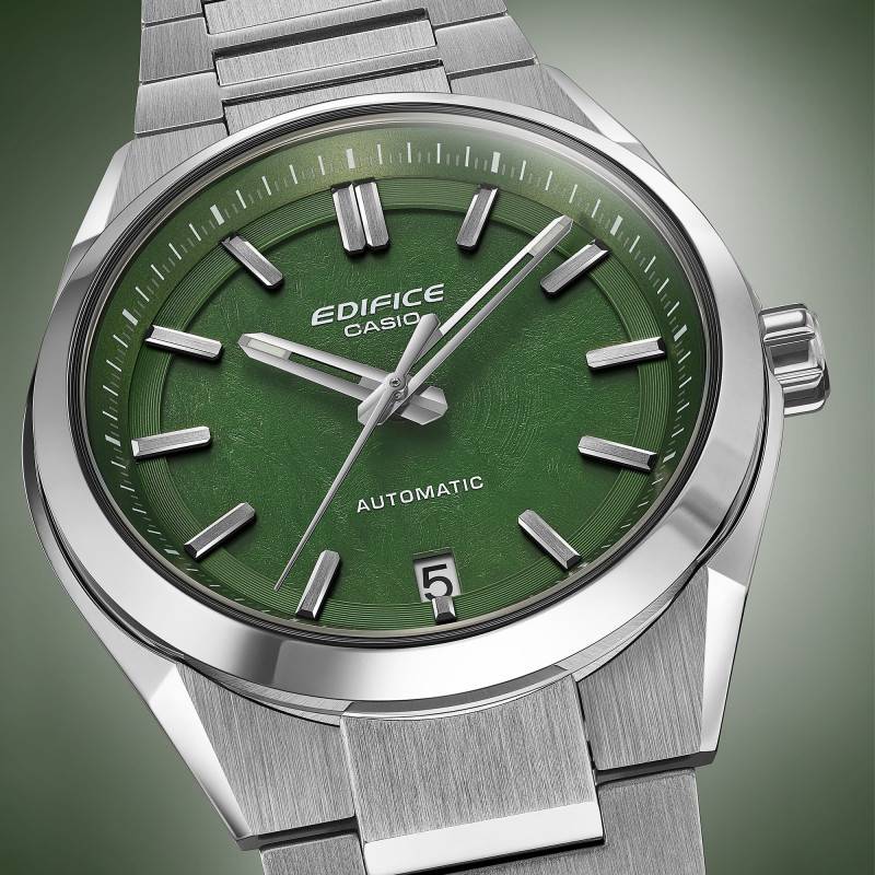 Le cadran de cette montre Casio est un spectacle de design et de fonctionnalité ingénieuse. Arborant une profonde couleur verte, le cadran texturé affiche un motif carbone qui ajoute une dimension moderne et dynamique. Ce style texturé capte la lumière d'une manière captivante, offrant un jeu de reflets atypique. Les aiguilles analogiques pour les heures, les minutes et les secondes parcourent le cadran avec fluidité, et un guichet de date est subtilement placé à six heures. Un chemin de fer des minutes orne la lunette, accentuant la précision horlogère de cette montre. Le cadran est protégé par un verre saphir d'une clarté remarquable, prévu pour résister aux rayures et offrir une visibilité optimale, quelles que soient les conditions lumineuses.