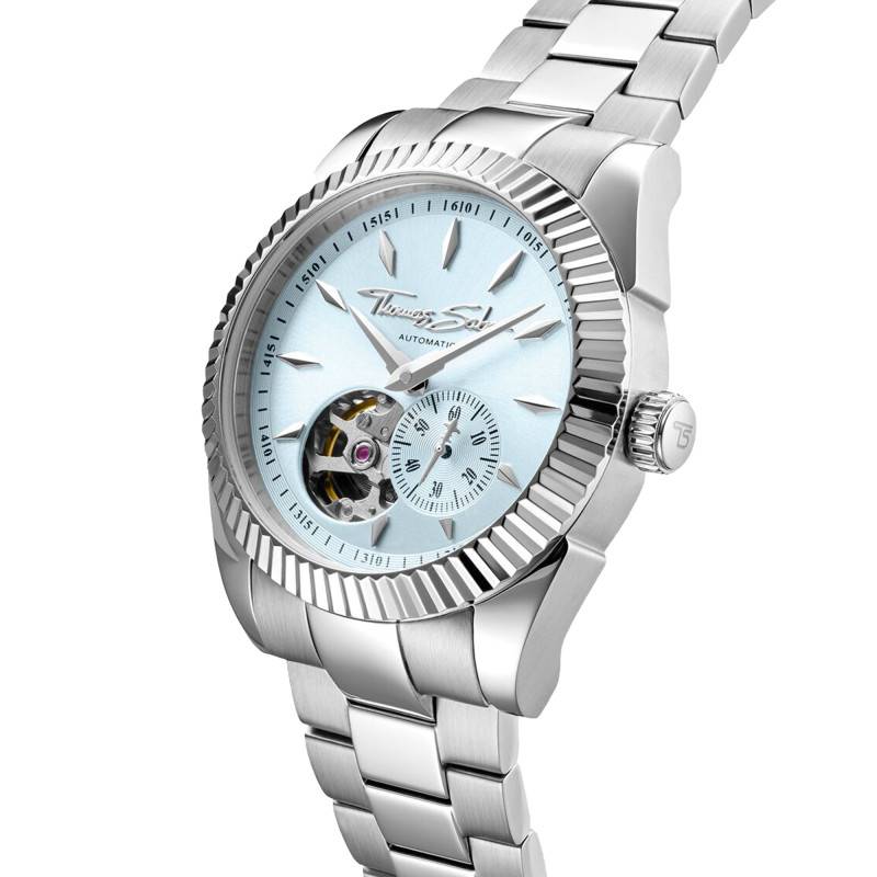 Le cadran de cette montre est une véritable œuvre d'art avec sa couleur bleu glacier qui capte magnifiquement la lumière, créant des reflets fascinants grâce à un effet soleillé soigné. Les aiguilles acérées et les index marquent les heures avec une précision remarquable, créant une harmonie entre fonction et design. Un ouverture sur le cadran révèle une partie du mécanisme, offrant un aperçu fascinant du mouvement automatique squelette Miyota 8N40. Les chiffres, d'une exécution parfaite, et la petite seconde placée judicieusement ajoutent une fonction utile et un équilibre esthétique travaillé. L'ensemble est protégé par un verre saphir plat, connu pour sa résistance supérieure aux rayures.