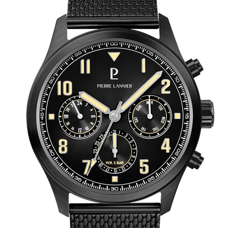 La montre Pierre Lannier Aviateur 258M439 se distingue par son allure audacieuse et moderne, parfaitement adaptée à l'homme contemporain. Dotée d'un boîtier rond de 42,50 mm en acier inoxydable avec une finition mate et un revêtement PVD noir, elle associe robustesse et style. Le verre de cette montre est en Gorilla Glass, conférant une grande résistance à l'usure et aux rayures. Le poids de la montre est soigneusement équilibré à 60 grammes, permettant un port confortable pendant de longues périodes. Elle est équipée d'un fond emboîté pour une finition nette et épurée, tout en assurant sa résistance à une étanchéité de 5 ATM.