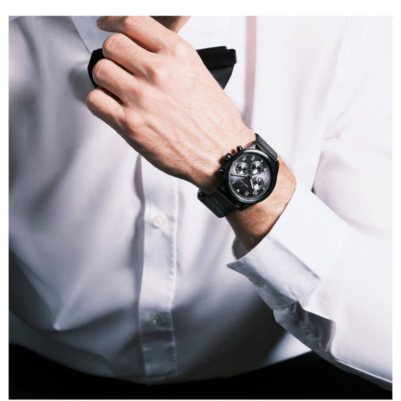 Le cadran de la montre est une véritable réussite esthétique. En noir, avec une finition soleillée, il capte majestueusement la lumière pour donner des reflets changeants en fonction de l'angle de vue. Les chiffres arabes dorés ajoutent une touche de sophistication et de lisibilité, avec des aiguilles et des index revêtus de matériau luminescent pour une visibilité même dans l'obscurité. Le chemin de fer des minutes confère une précision élégante et raffinée à la lecture du temps. À cette élégance s'ajoute une fonctionnalité pratique avec trois compteurs additionnels et un guichet pour la date, situés harmonieusement sur le cadran.