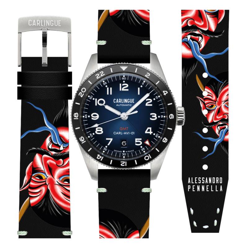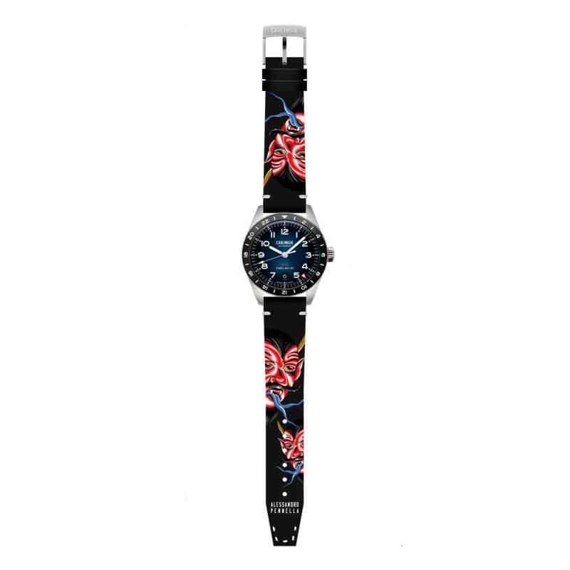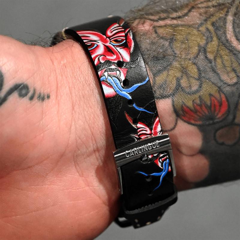 Le bracelet de cette montre est une véritable œuvre d'art. En cuir blanc, il arbore une impression spéciale multicolore «Il Diavolo», fruit de l'imagination du tatoueur Alessandro Pennella. Ce design audacieux à l'effigie du diable avec sa langue bleue reflète un style inimitable. Avec une entrecorne de 20 mm, il s'accorde parfaitement avec le boîtier, tandis que le fermoir boucle ardillon en acier argenté apporte une touche finale élégante et sécurisée. Ce bracelet est non seulement un accessoire de mode, mais aussi un hommage à l'art horloger traditionnel et à la créativité contemporaine.