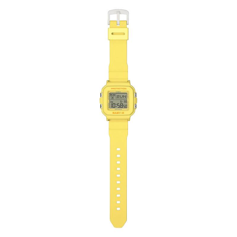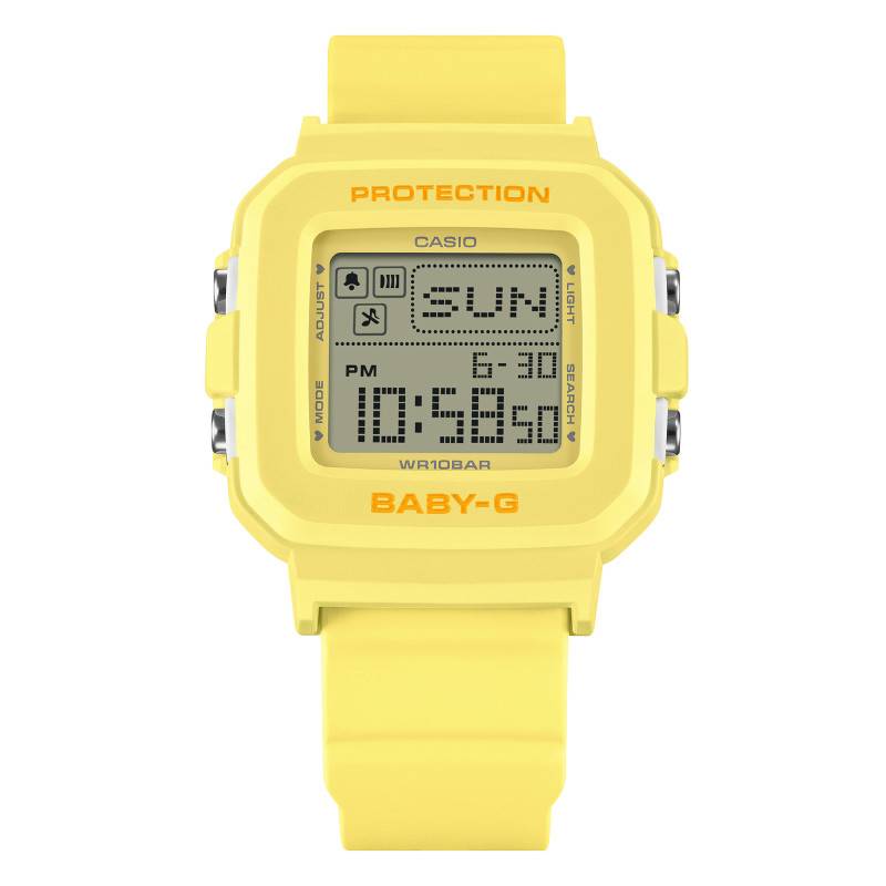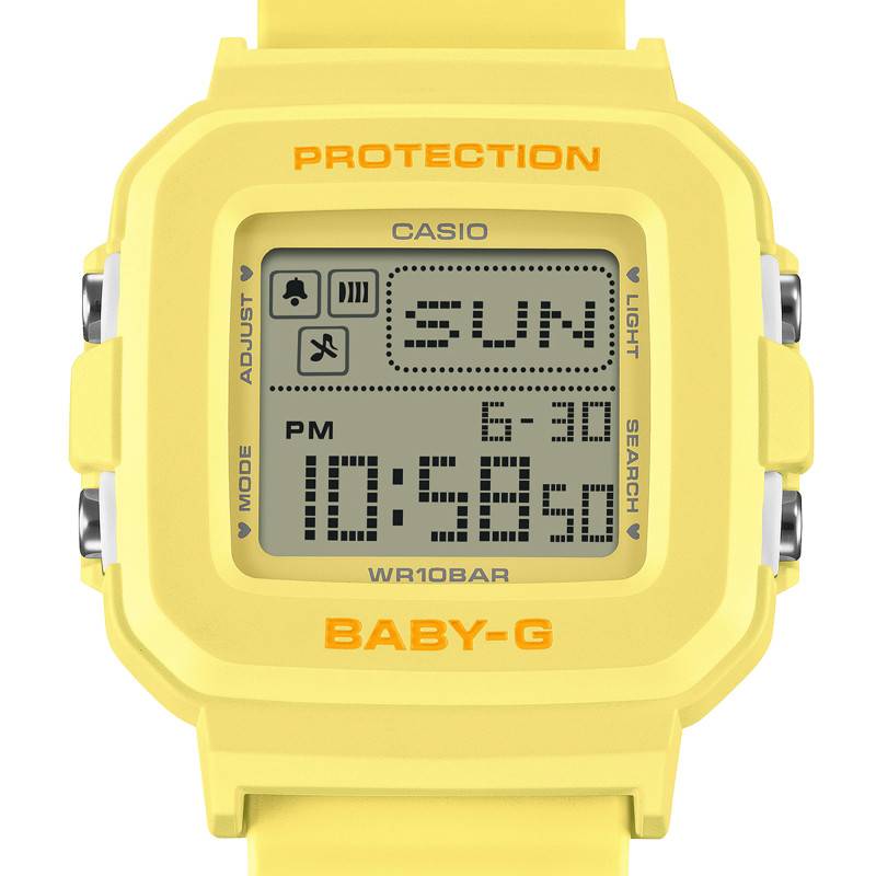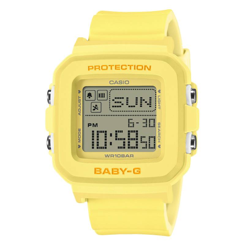 La Casio Baby-G est une montre moderne qui mélange harmonieusement style et fonctionnalité. Conçue spécialement pour la femme active, ce modèle impressionne par son boîtier en résine jaune de forme coussin. Les dimensions équilibrées de 42,80 mm de longueur, 39,00 mm de diamètre, et 14,70 mm d'épaisseur offrent à cette montre une présence notable sans être invasive. Avec un poids de seulement 33 g, elle éprouve un confort inégalé au poignet, renforcé par la qualité de son confectionnement japonais. La montre est équipée d'un verre minéral qui garantit une résistance décente contre les éraflures du quotidien.