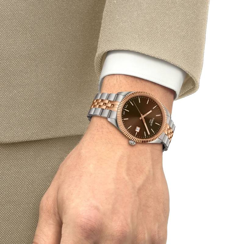 Le cadran de cette Tissot est un véritable chef-d'œuvre. Sa couleur marron associée à une finition guillochée crée un jeu de lumière subtil qui attire immédiatement l'œil. Les index et aiguilles luminescents permettent une lecture facile, même dans des conditions de faible luminosité, tandis que le chemin de fer des minutes assure une précision inégalée. Le guichet date, discrètement placé, ajoute à la fonctionnalité sans nuire à l'harmonie visuelle du cadran. Protégé par un verre saphir plat avec traitement antireflets, ce cadran est conçu pour résister aux rayures et garantir une visibilité optimale en toutes circonstances.